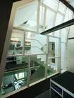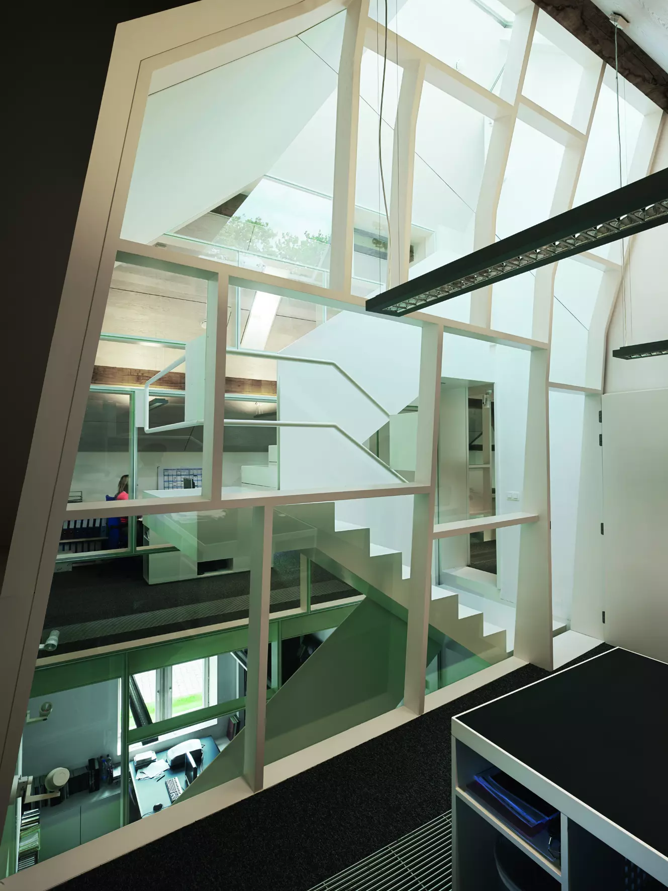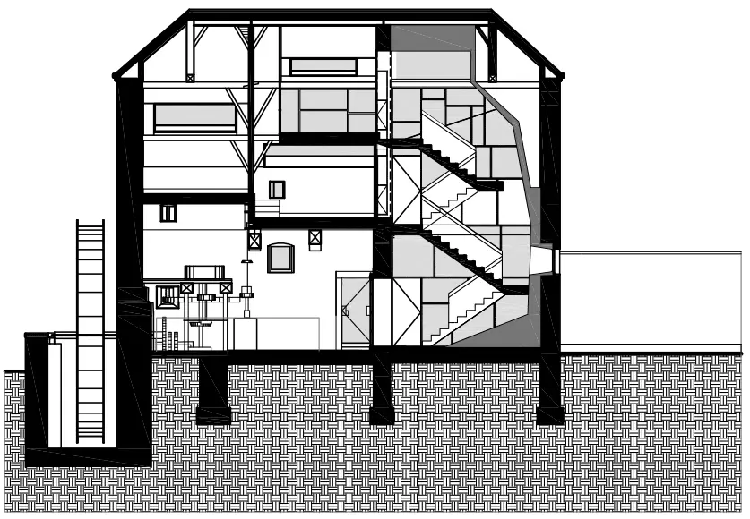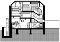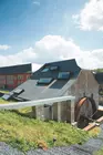 Tous les locaux techniques sont concentrés dans l'appentis qui est un prolongement enfoui dans le talus, recouvert d'une nappe végétale en prolongement de la prairie fleurie du talus.