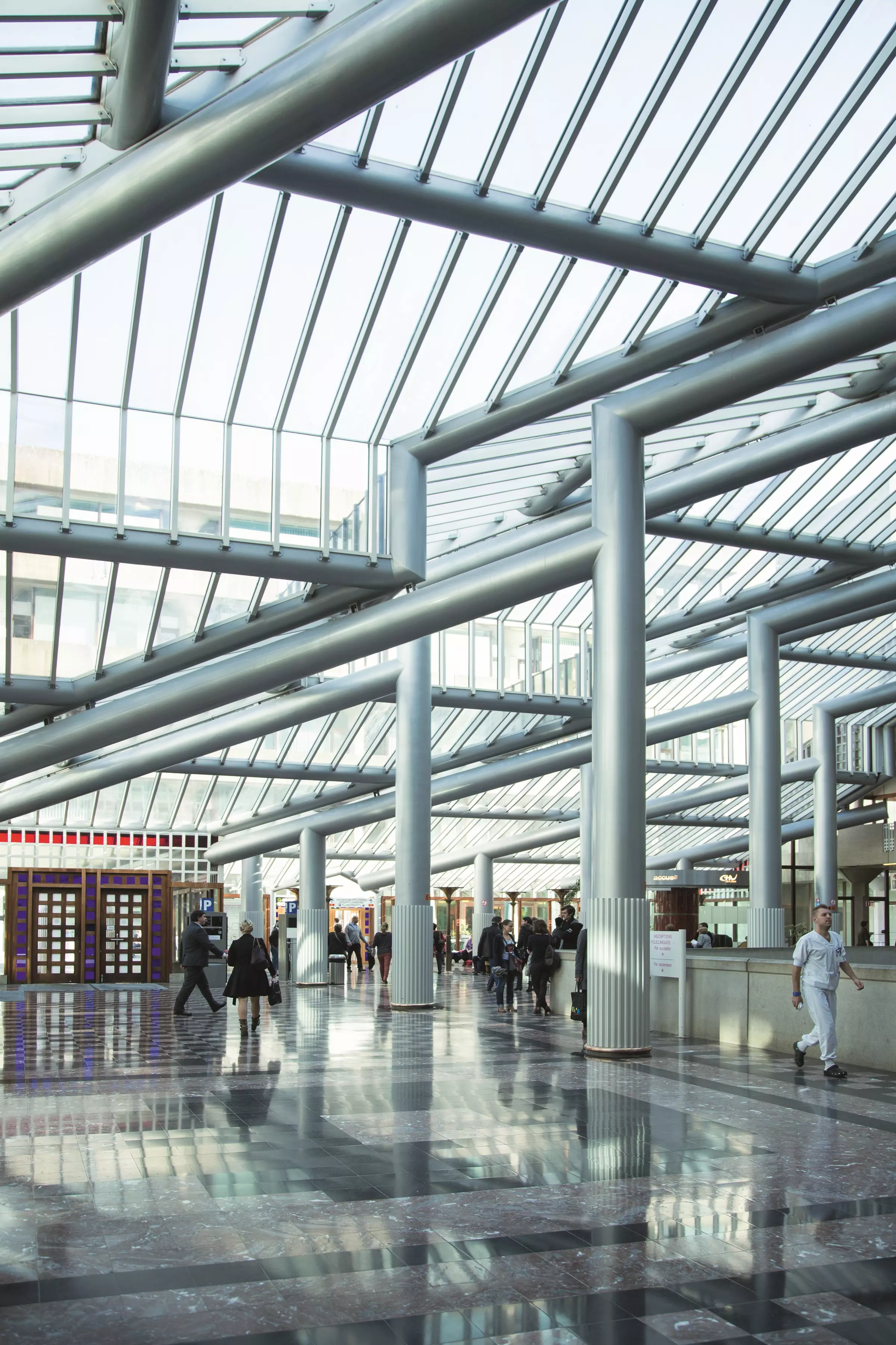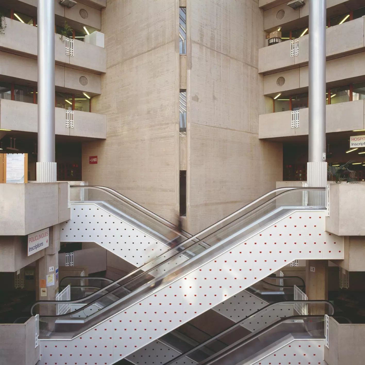 Déjà appliqué dans la construction des Laboratoires de recherche et d'enseignement de Louvain-la-Neuve (1972), son principe constructif repose sur l'emploi majoritaire du béton préfabriqué ; sa mise en œuvre sur une trame modulaire de 7,20 x 7,20 m permet de créer des plates-formes cloisonnables selon une grande variété de combinaisons aisément modifiables, une souplesse encore renforcée par la localisation d'un niveau technique entre chaque étage, ce qui facilite les interventions sans interrompre l'activité du site. La grande verrière qui éclaire le bloc central constitue un véritable morceau de bravoure ; elle a, à ce titre, été classée comme monument en 1994.