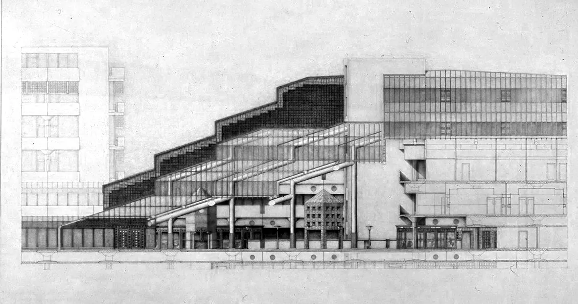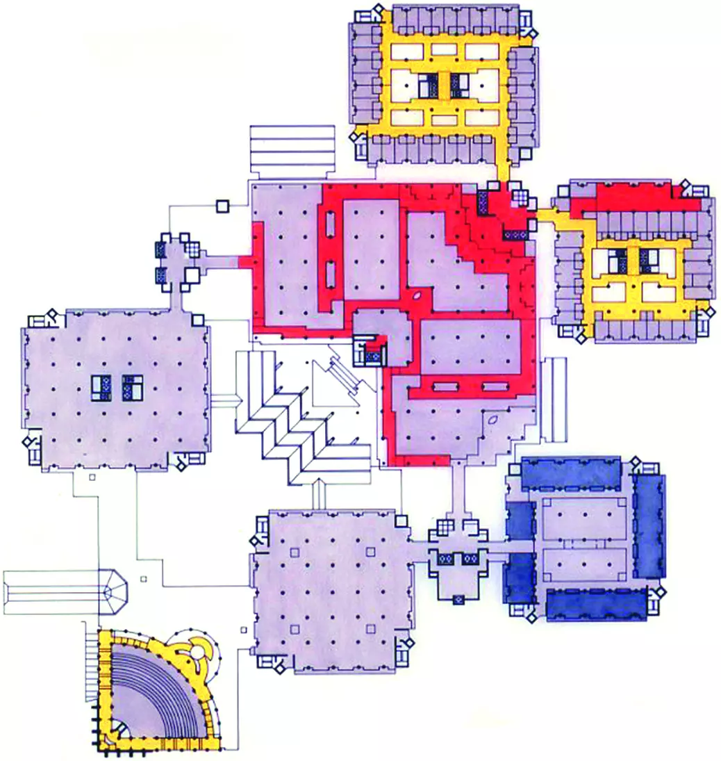L'architecte élabore un plan-masse qui exploite tant les avantages d'un hôpital pavillonnaire – séparant les malades suivant le type de pathologie – que ceux d'une conception monobloc, bien adaptée aux impératifs d'une gestion pratique.