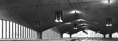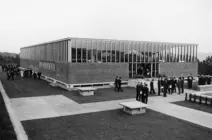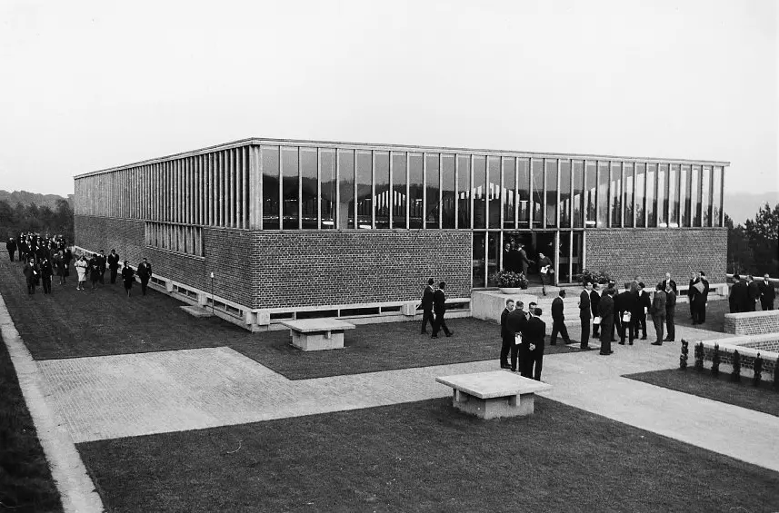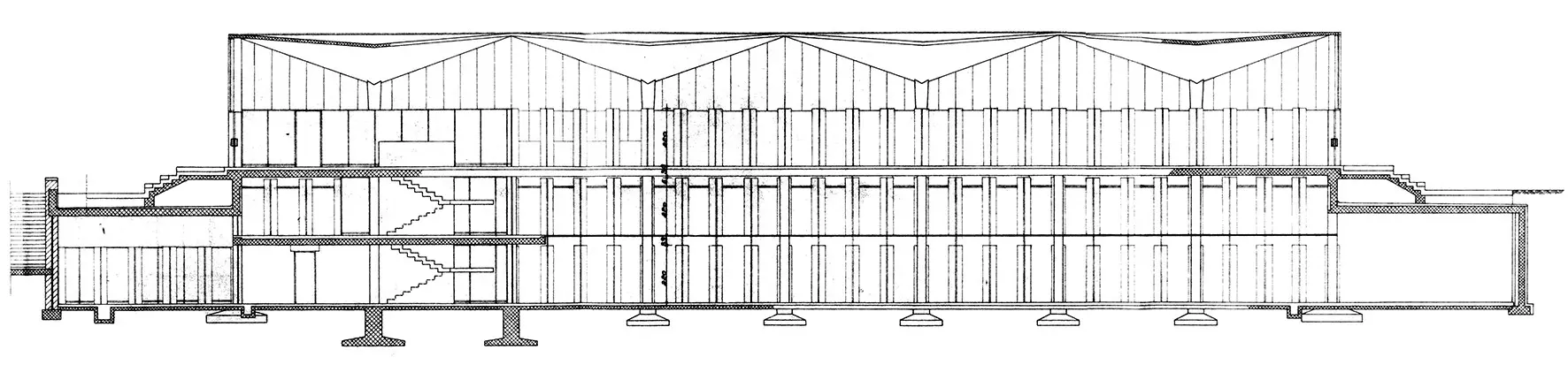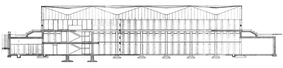 Son implantation en un point périphérique du site, sous la zone réservée à l'hôpital, a pour objectif de ne pas contrarier le plan d'urbanisation du domaine, non encore défini à l'époque de sa construction. L'étage inférieur, très peu éclairé par la lumière naturelle, comporte un plancher intermédiaire en béton, servant de palier pour l'escalier et la cage d'ascenseur. Ce plancher se prolonge sur toute la surface du bâtiment par une structure légère et démontable. Entièrement vitré dans sa partie supérieure, le second niveau laisse apparaître les quatre imposants paraboloïdes hyperboliques qui composent la toiture.