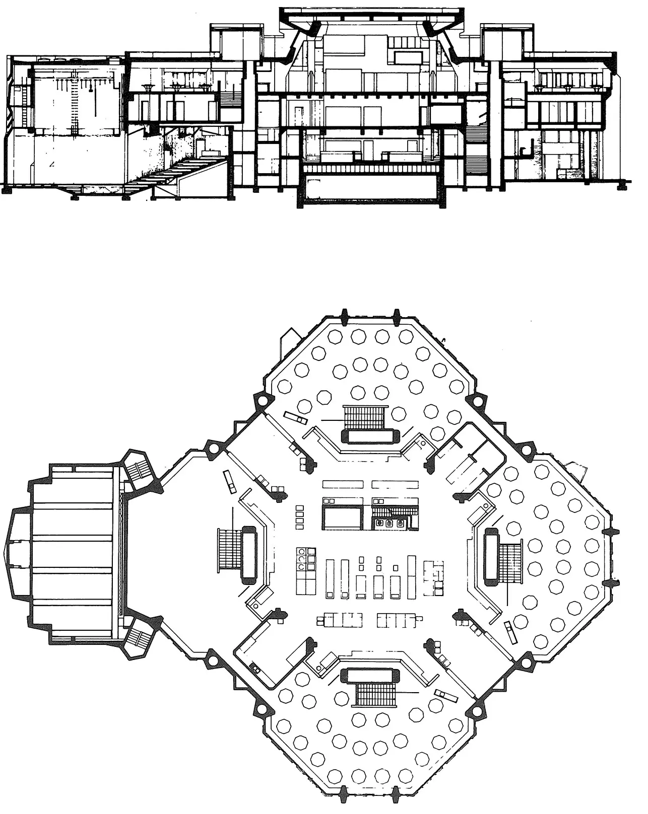À la symétrie extérieure s'oppose un rez-de-chaussée sinueux, presque labyrinthique, qui regroupe des espaces aux caractères variés : recoins confinés, zones en contrebas et hautes salles lumineuses. La conception joue sur les rapports à la lumière, au niveau ou au volume. L'étage intermédiaire, inaccessible au public, est à vocation logistique. Enfin, le dernier niveau comporte une vaste cuisine centrale autour de laquelle s'articulent quatre salles de nonante places accessibles indépendamment par quatre escaliers partant du rez-de-chaussée. Véritable belvédère, il offre une vue imprenable sur les horizons boisés. Une salle de spectacle de trois cents places complète le programme.