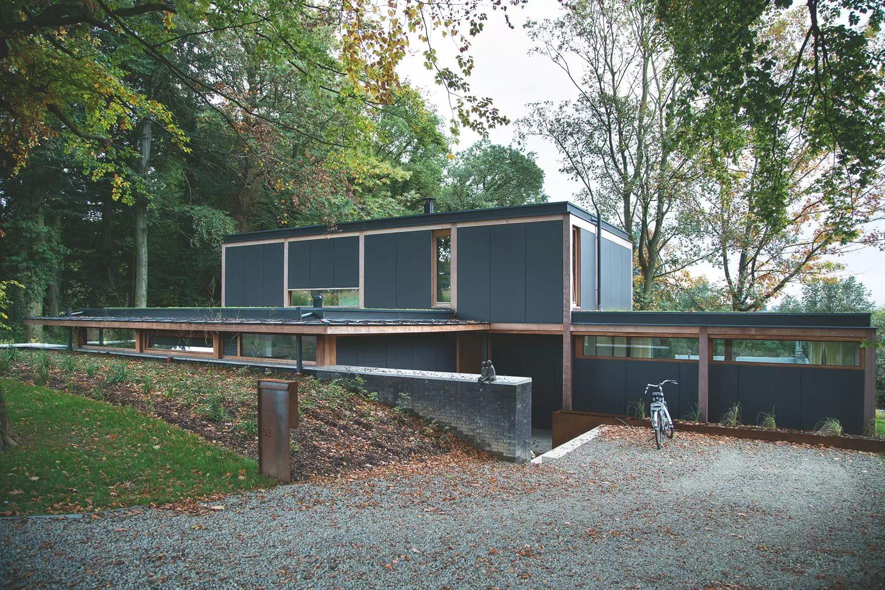 L'habitation est positionnée à flanc de colline, dans un environnement suburbain. Au sud, elle s'ouvre sur le paysage et manifeste le dessin de son ossature bois. L'ordre régulier de la trame contraste avec le remplissage qui confond vitrages, parois et écrans solaires au gré des usages. Au nord, la façade, presque aveugle, ménage un retrait et ne conserve du dessin de la structure que quelques éléments.