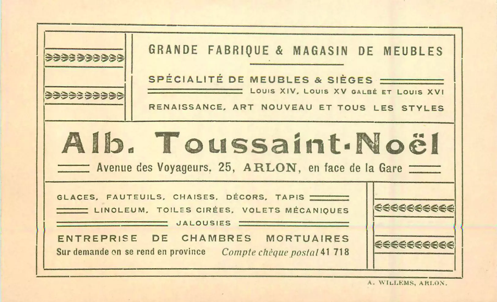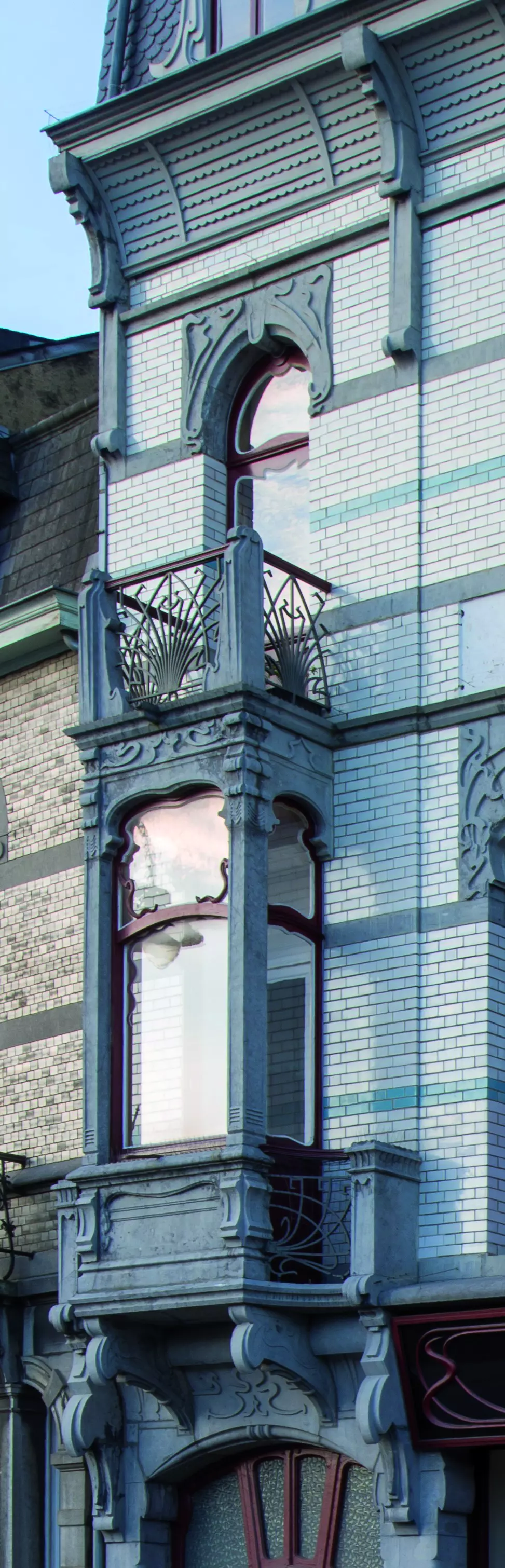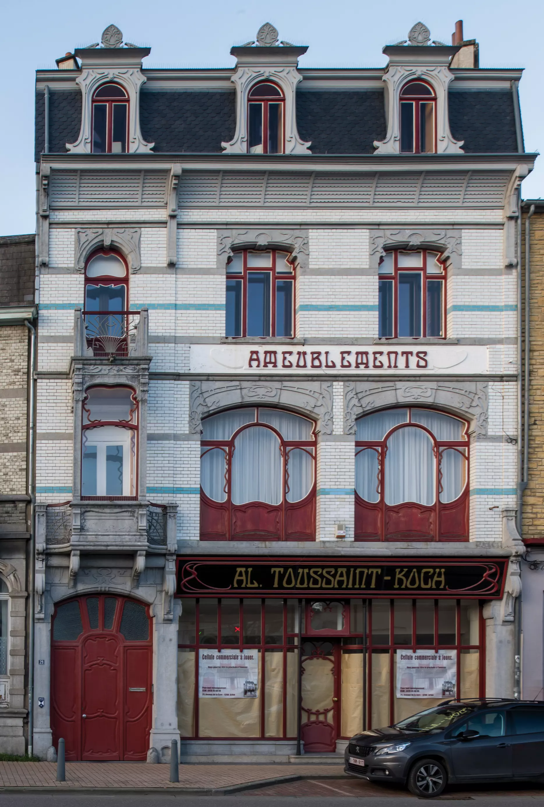 Stratégiquement installée face à la gare, cette construction mêlant habitation unifamiliale et rez-de-chaussée commercial abrite à l'origine un magasin de meubles. L'immeuble de trois étages rassemble de nombreux éléments caractéristiques de l'Art nouveau. La façade dominée par la brique vernissée blanche offre un riche répertoire décoratif qui s'exprime d'abord dans la pierre taillée et dans la ferronnerie aux lignes en coups de fouet. Tant la porte latérale surplombée d'un oriel en petit granit que les châssis des baies aux étages s'inscrivent dans la même tendance. Plusieurs éléments sont reconstitués à l'identique dans le cadre de la rénovation complète du bâtiment en 2014.