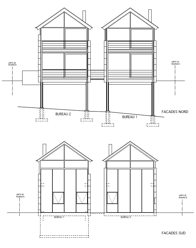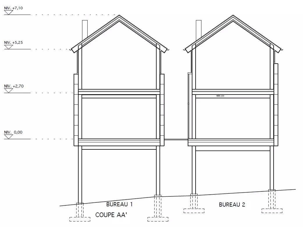 Bâti à flanc de versant, le bâtiment qui abrite des bureaux et l'atelier de l'architecte reprend des traits caractéristiques des villas 'cottage' de son environnement. En témoignent le caractère détaché du bâtiment sur pilotis, son retrait de l'alignement, sa composition en plusieurs volumes ou encore les lignes faîtières perpendiculaires qui dessinent un pignon triangulaire à rue. Source de polémique lors de l'octroi du permis, la modernité est affirmée par les abondantes parties vitrées des façades avant et arrière - donnant vue sur la vallée - ou l'empilement des dalles de bardage de béton cellulaire laissés bruts pour les murs latéraux, résultats d'une expérimentation dans la rationalisation des moyens. Le bâtiment évoque d'autres réalisations de l'architecte, dont les maisons Fagot-Levaque, Schumacher, Legrand. Les bureaux sont conçus pour être facilement adaptables en logements.