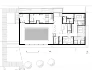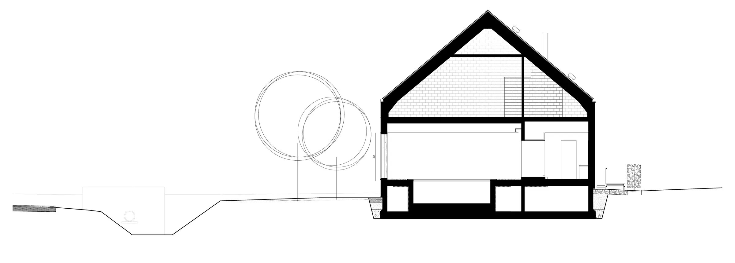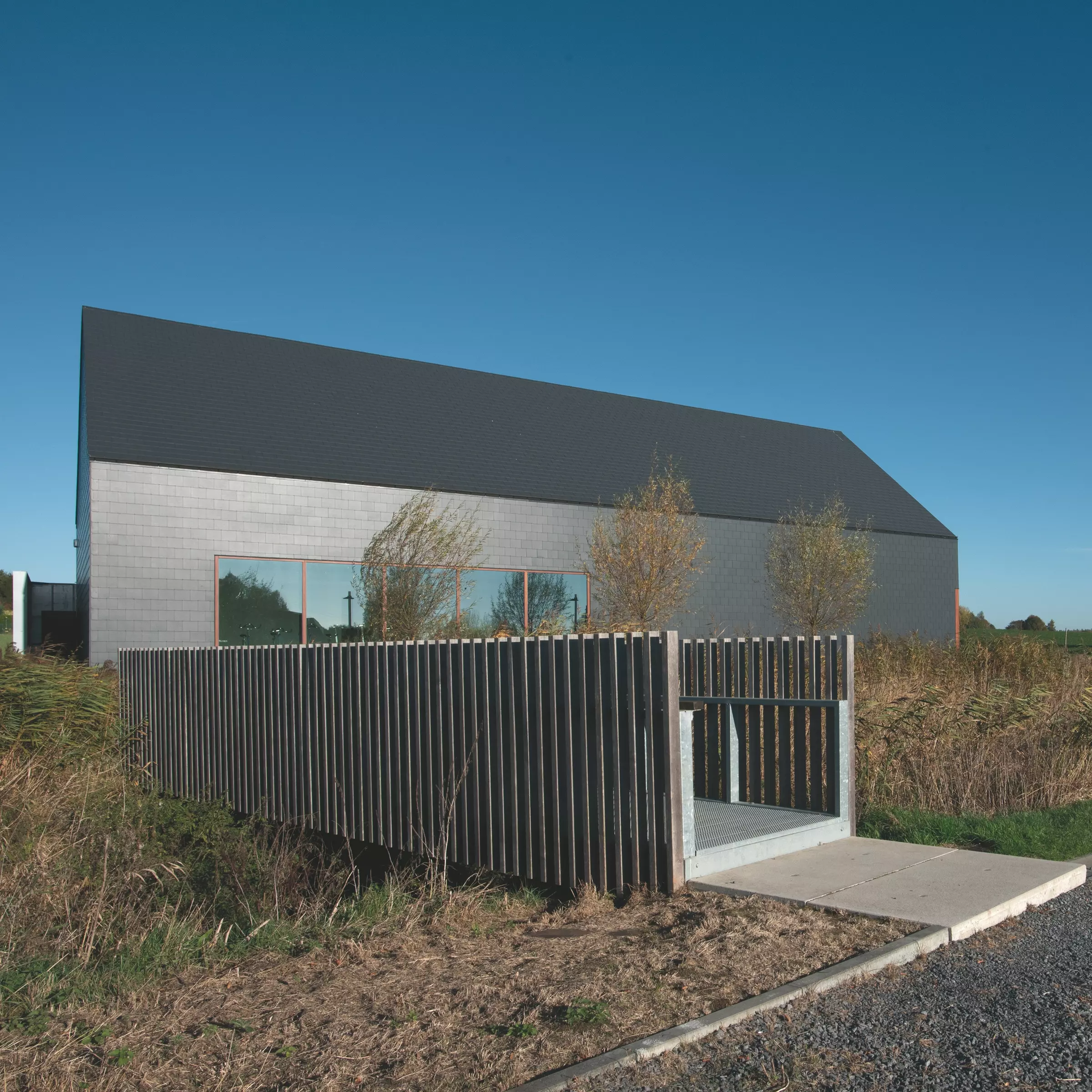 Implanté au cœur du pays des Collines, l'édifice reprend la silhouette traditionnelle des fermes voisines à travers une écriture très sobre. Cette réinterprétation de l'archétype n'est pas sans rappeler le « loft rural » situé quelques mètres plus loin, l'une des premières réalisations de l'un des associés du bureau. Ici, le volume géométrique se distingue par une continuité du matériau entre toiture et façades. Son ouverture se limite aux deux baies situées de part et d'autre de l'angle sud-est, préservant l'aura mystérieuse de l'édifice, mais aussi l'intimité de ses usagers. Une fois le soir tombé, la bulle devient lanterne. Malgré son caractère introspectif, l'architecture n'en est pas moins attentive à son environnement. En témoigne la mise à profit du ry traversant la parcelle dans le dessin de la séquence d'entrée. Point de départ d'une courte promenade à travers les abords aménagés de l'édifice, un ponton franchit le cours d'eau, droit vers le paysage.