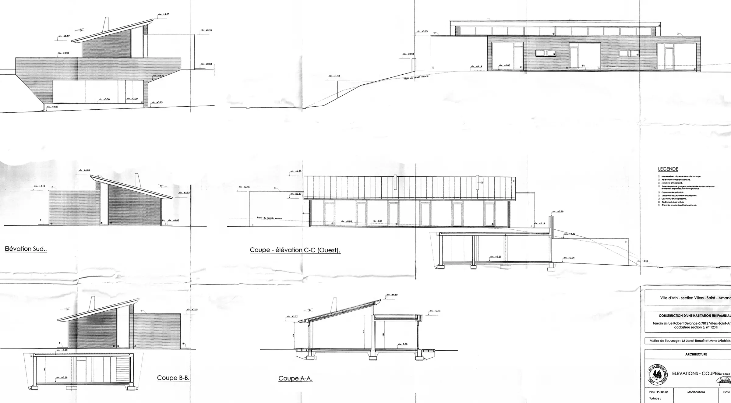 Dessinant ici sa propre maison, l'architecte exprime le désir de se mettre à distance du monde extérieur. Il choisit un terrain éloigné de toute agglomération urbaine, entre une grand-route menant à Ath et des champs à perte de vue. D'un côté et de l'autre, le bâtiment présente deux profils radicalement différents : vers la rue, une façade majoritairement fermée et très articulée, et une façade vers le jardin, totalement ouverte et parfaitement plane. La première nie tout rapport à l'espace public, tout juste s'y raccroche-t-elle par une légère pente menant au garage. La seconde génère une continuité entre le dedans et le dehors. Une relation renforcée par la sobriété des matériaux et de leur mise en œuvre (massif de briques et châssis en bois tout en hauteur). Au sein de l'habitation, le plan est des plus rigoureux : les quartiers de jour et de nuit s'ordonnent de chaque côté d'un imposant mur de briques. Séparation que l'on devine d'ailleurs dans la volumétrie générale, marquée par le découpage des toitures.