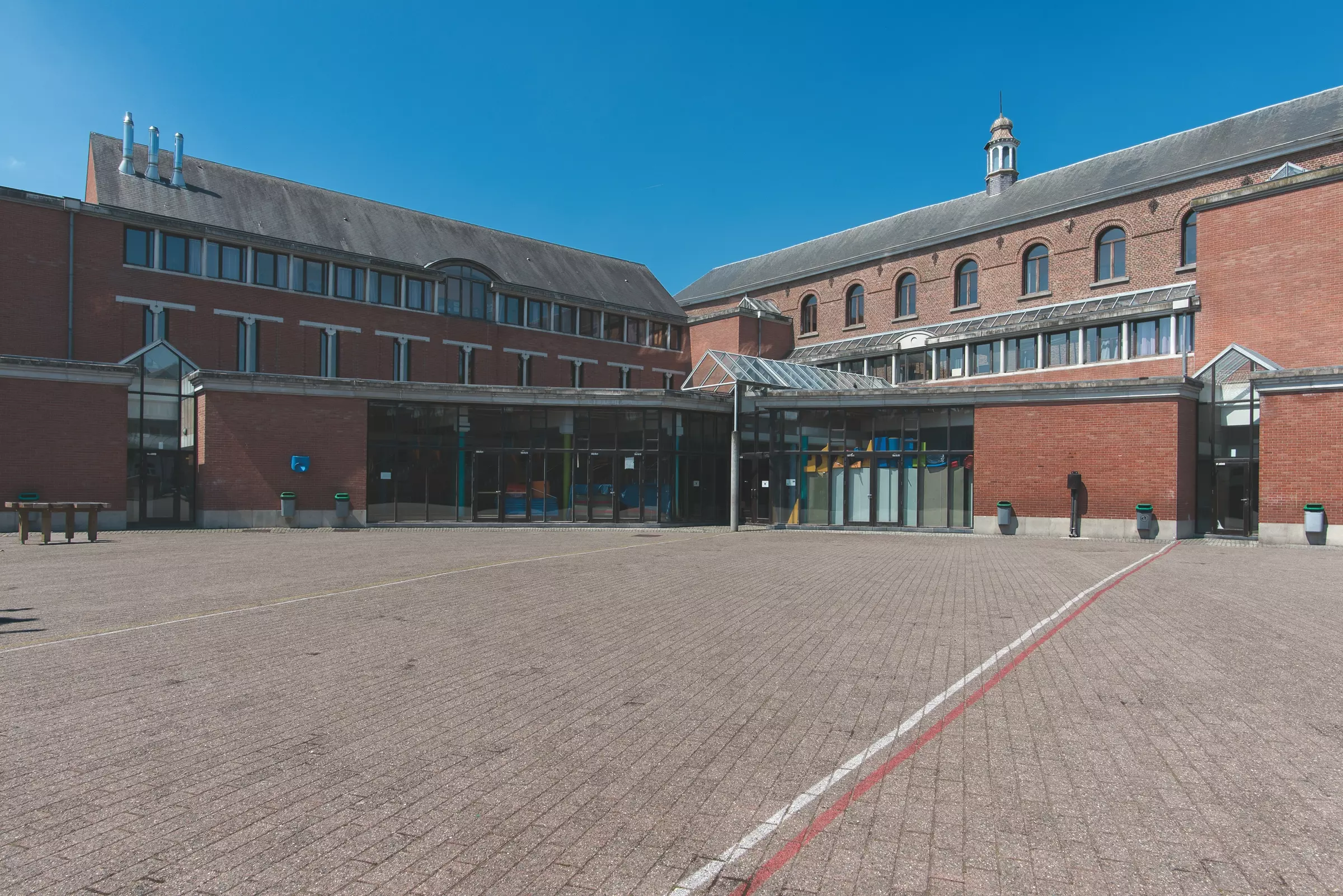 Dès 1876, les architectes Mottrie et Fumière conçoivent un nouveau bâtiment pour le Collège royal (qui deviendra Athénée royal). De style éclectique, la façade de briques et de pierre est conservée et restaurée lors des travaux entrepris en 1989 sous la direction du bureau AURA. À cette occasion, l'ancienne aile du collège communal du XVIIIe siècle est remplacée par une construction contemporaine. Tant la volumétrie que le vocabulaire sont pensés pour une intégration harmonieuse au bâti existant. On reconnaît néanmoins le langage postmoderne de l'architecte Jonet, notamment au travers des colonnettes formant meneaux. Intégré à l'opération, le réfectoire est dessiné dans un style identique. L'ancien porche de la maison du Lombard, datant du XVIe siècle, y est rattaché.