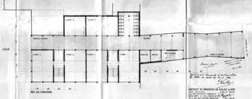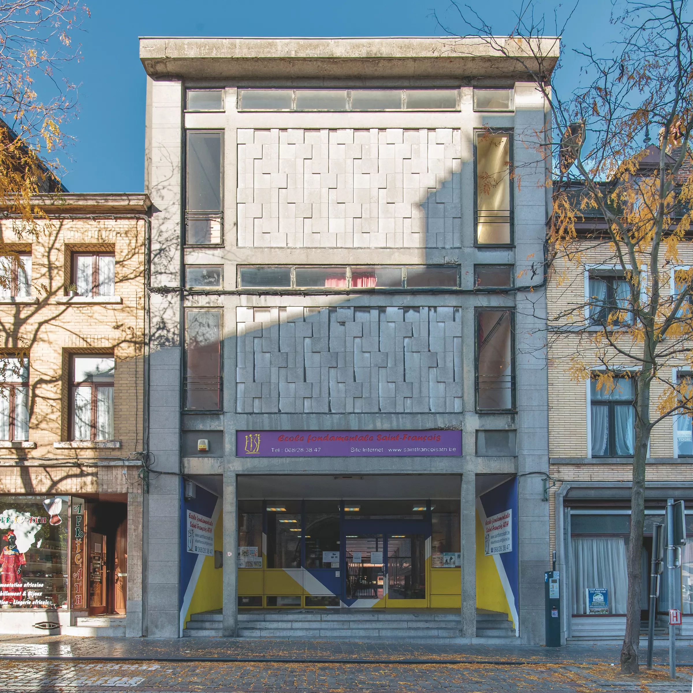 Érigé à l'origine pour abriter l'école des filles, l'institut Saint-François fait directement face à l'église Saint-Julien. La force dégagée par les deux édifices use de moyens similaires : apparence naturelle du matériau et simplicité de mise en œuvre. Concernant le plus récent, cette radicalité s'inspire clairement du courant brutaliste, à son apogée lors de la construction du bâtiment. Celui-ci en présente tous les codes : utilisation du béton dans sa forme brute, absence totale d'ornement, découpage sériel des ouvertures et déploiement d'une trame sur la base d'un motif géométrique. Le tracé de lignes verticales sur toute la hauteur de la façade en renforce la verticalité. Au rez-de-chaussée, l'entrée se retire vis-à-vis de l'espace public : un emmarchement mène à une galerie couverte étirée à travers la parcelle, dans le prolongement de la nef principale.