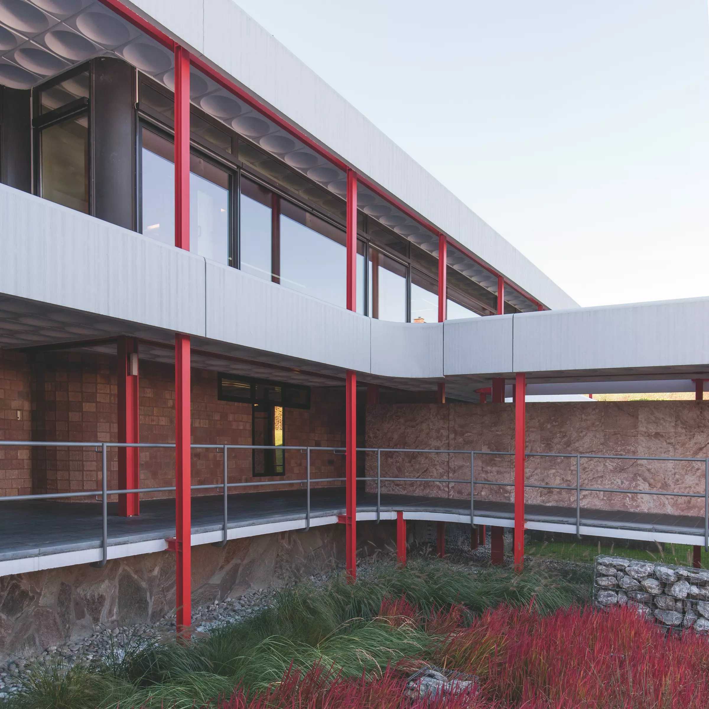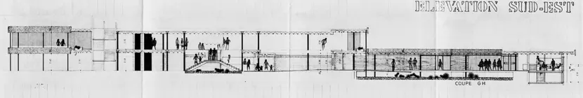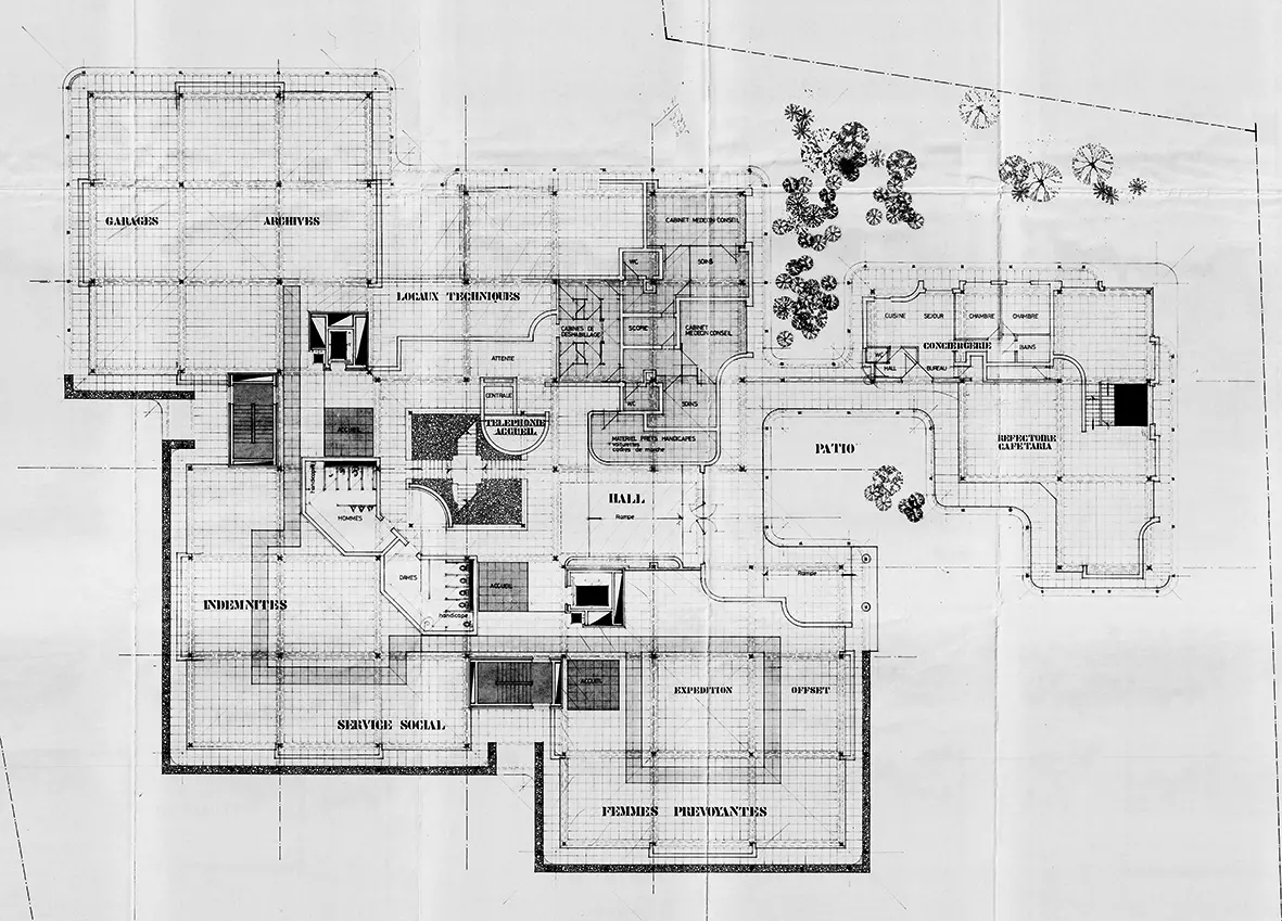 On observe ainsi cinq figures carrées identiques, chacune divisée en neuf figures carrées. Ce schéma hyper rigoureux sert de support à la disposition des éléments programmatiques (les cinq carrés renvoient aux fonctions principales : administration, consultation, cafétéria, technique ou archives) et structurels (les éléments porteurs se localisent à l'angle des plus petits carrés). Pour autant, cette rigueur est très vite dépassée par la volonté de développer une architecture adaptable et expansive, à l'image d'un organisme vivant. Il en va ainsi de certains accidents du dessin (soustractions, découpes et lignes courbes) et plus encore de la fluidité des circulations et de l'interconnexion des espaces.