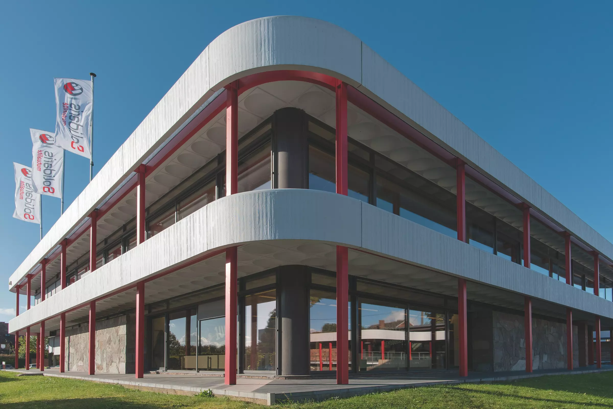 Basculée dans les trois dimensions, la construction confirme son ancrage dans la postmodernité par la combinaison d'influences classique et moderne. Sur le premier point, on relève le linéaire de poteaux ceinturant l'édifice (façon péristyle) ou sa position sur une esplanade surélevée (façon socle). Sur le second point, on relève la prédominance de l'horizontale (continuité du bandeau vitré périphérique et débord des dalles) ou d'autres choix esthétiques (plafonds alvéolaires et béton architectonique). L'esprit structuraliste se retrouve enfin jusqu'à l'aspect social du programme (ici, une mutualité), que partagent nombre des projets du mouvement (logements collectifs, maisons de repos, orphelinats, etc.).