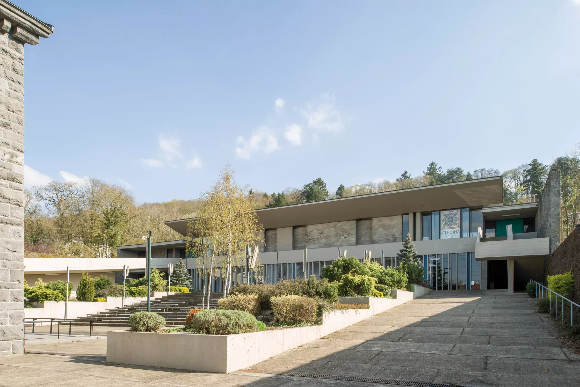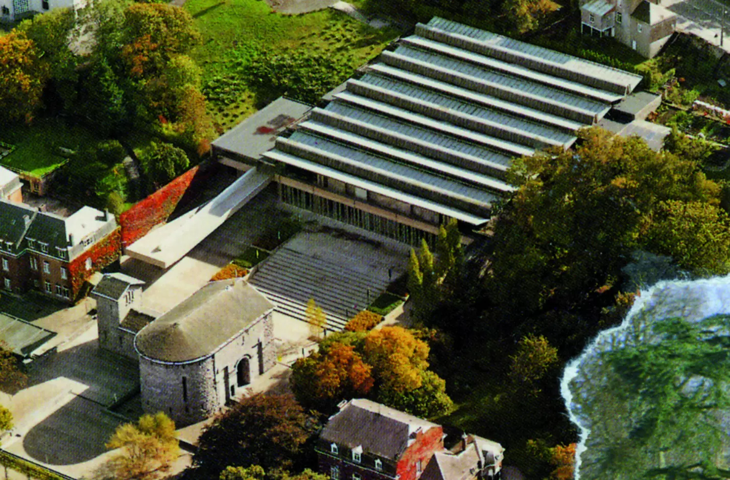 L'implantation par Bastin des deux églises principales en fond de parcelle tire parti du relief abrupt de la colline qui marque la limite entre la plaine de la Famenne et les plateaux ardennais.