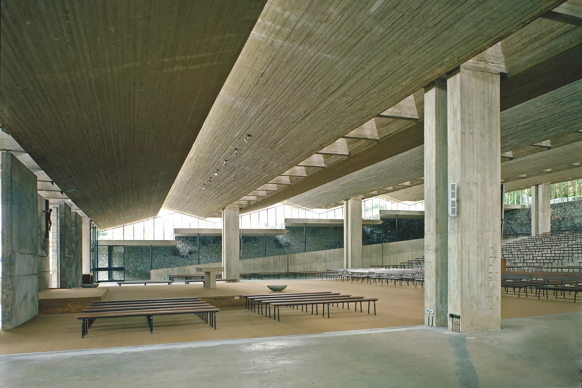 Engoncée dans la roche, l'église du Rosaire est un espace large et peu profond, de plan rectangulaire, qui fait office de grande crypte pour l'église supérieure qui la surplombe. Celle-ci, conçue comme une vaste halle (2 500 m²) à laquelle on accède latéralement par des rampes et escaliers extérieurs, peut contenir plusieurs milliers de personnes. Sa toiture est composée de cinq auvents de 40 m de long sur 10 m de large, constitués par une poutre-caisson supportée par des deux paires de colonnes jumelles écartées de 24 m, entre lesquelles filtre une lumière diffuse. Elle est rendue indépendante du sol et des parois latérales par un bandeau de vitrage sans châssis, dont l'effet recherché est celui de l'impression d'un espace extérieur couvert.