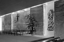 Au centre de cette esplanade trône la chapelle votive en moellons calcaires, édifiée par l'architecte Michel Claes dans les années 1950 dans un style néoroman empreint de symbolique.