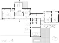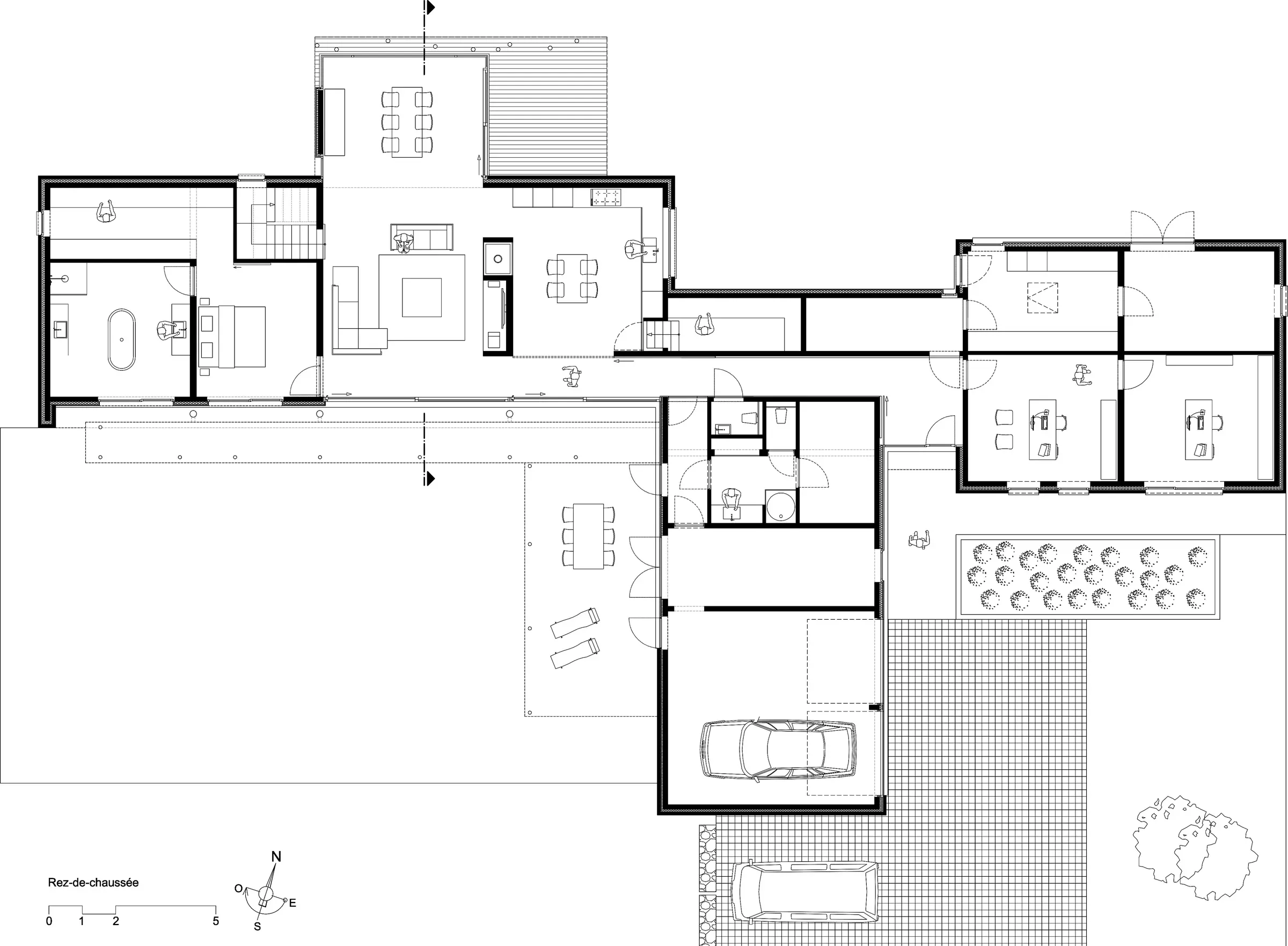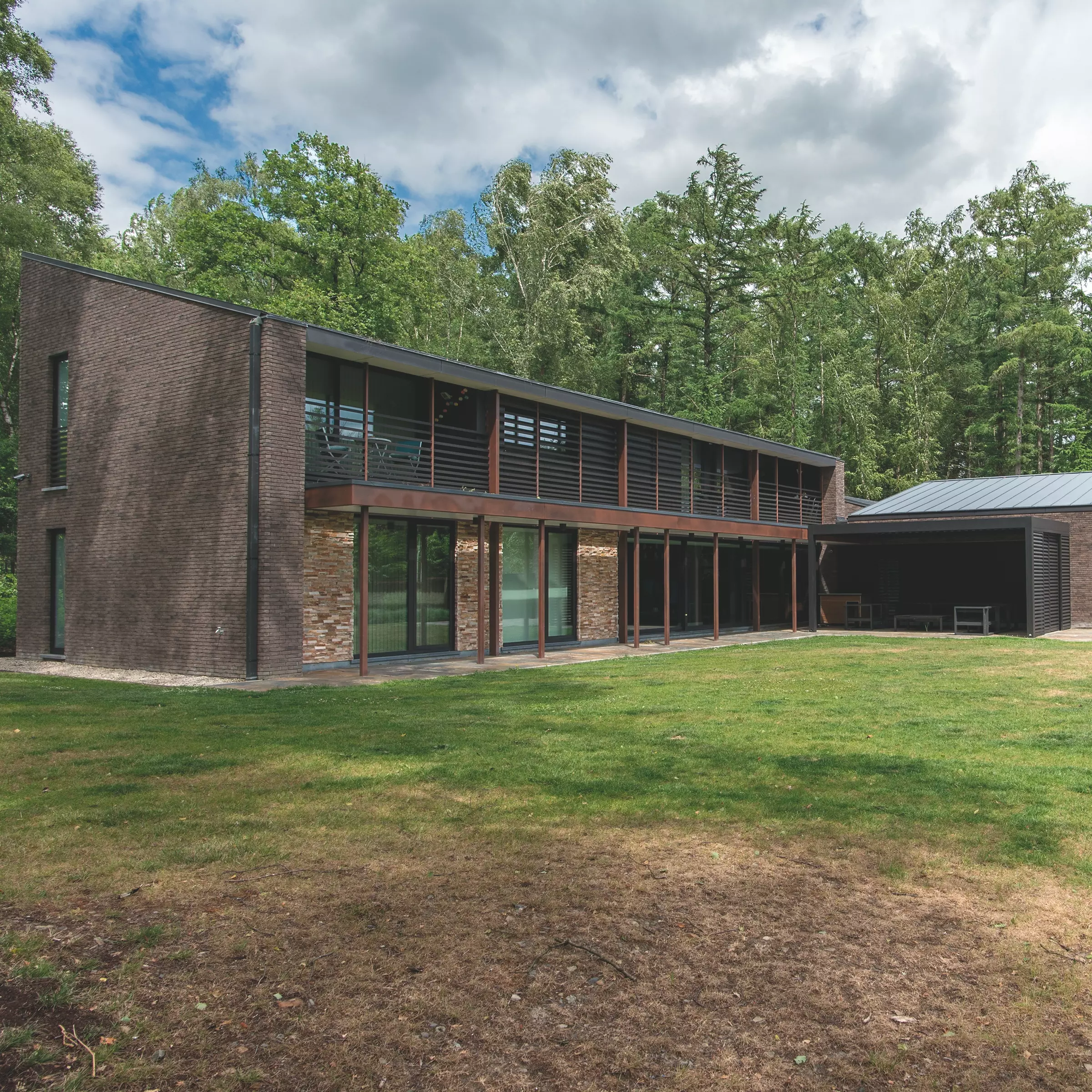 Au vu du programme conséquent prévu par les maîtres de l'ouvrage, le projet adopte une organisation pragmatique et facilement lisible : trois volumes principaux s'organisent sur une trame orthogonale, chacun abritant une fonction bien spécifique (espaces de vie, professionnels et de service). Le gabarit imposant des constructions et des aménagements (dont une séquence d'entrée aux dimensions plus que généreuses) ou encore l'implantation éclatée au sein d'une vaste parcelle boisée donnent à l'habitation des allures de village miniature. L'architecture affiche néanmoins une expression contemporaine : toitures à versant unique et larges parois vitrées, zinc et acier Corten. Enfin, les matériaux et les nuances entendent participer à la relation entre la bâtisse et le contexte naturel.