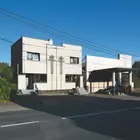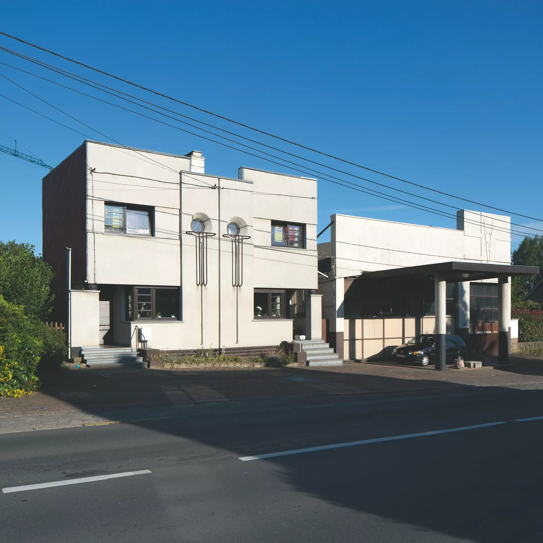 Le garage Ford V8 – dont le dessin enlace le V et le 8 en façade – et les deux constructions jumelles dialoguent dans leur composition maîtrisée, usant d'un enduit blanc uniforme.