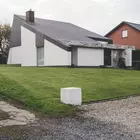 La ligne des toits et des murs se dirige vers le sol de façon à intégrer la construction à son environnement. La cheminée est utilisée comme point d'ancrage au sol et la sobriété expressive des façades accorde de l'importance aux contrastes en clair-obscur.