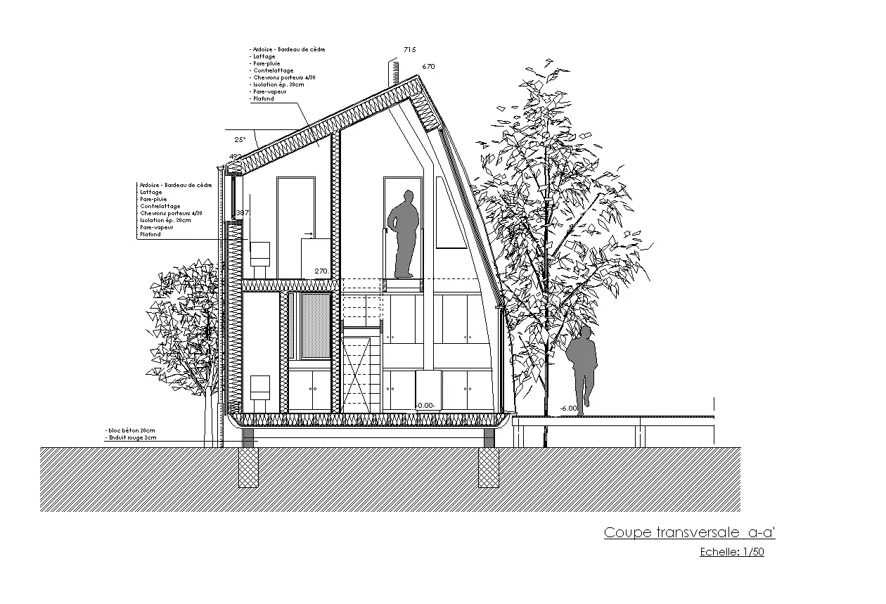 Sur deux assises de blocs de béton s'élève une coque en ossature bois, couverte d'un bardage en ardoises de cèdre, posé par le commanditaire. Chauffée par un poêle à bois, la maison s'ouvre largement vers le sud, où une haute fenêtre s'inscrit, sur les deux niveaux, au sein de la paroi courbe qui dynamise la relation du bâtiment à l'environnement.
