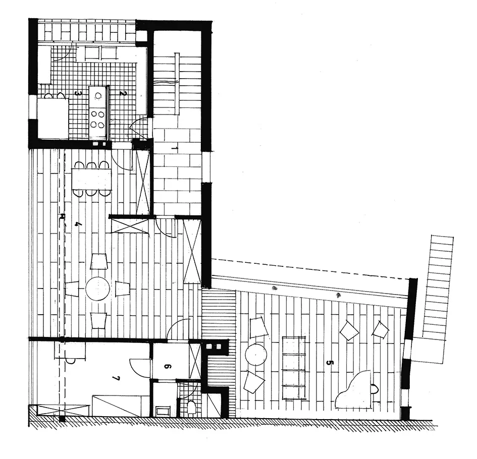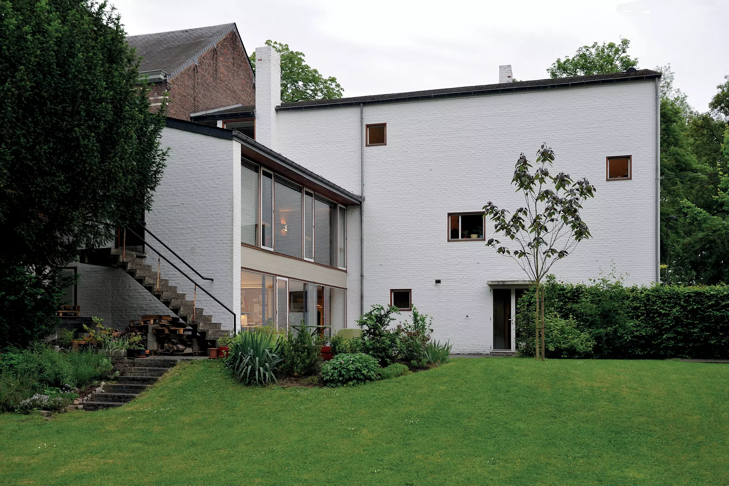 En contraste, la façade arrière du volume principal est majoritairement fermée vers le jardin et abrite les circulations. La seconde aile implantée perpendiculairement comporte, quant à elle, deux étages et s'ouvre pleinement vers le jardin, en se fermant côté mitoyen. L'entrée se fait sur le pignon, abritant deux loggias aux étages supérieurs.
