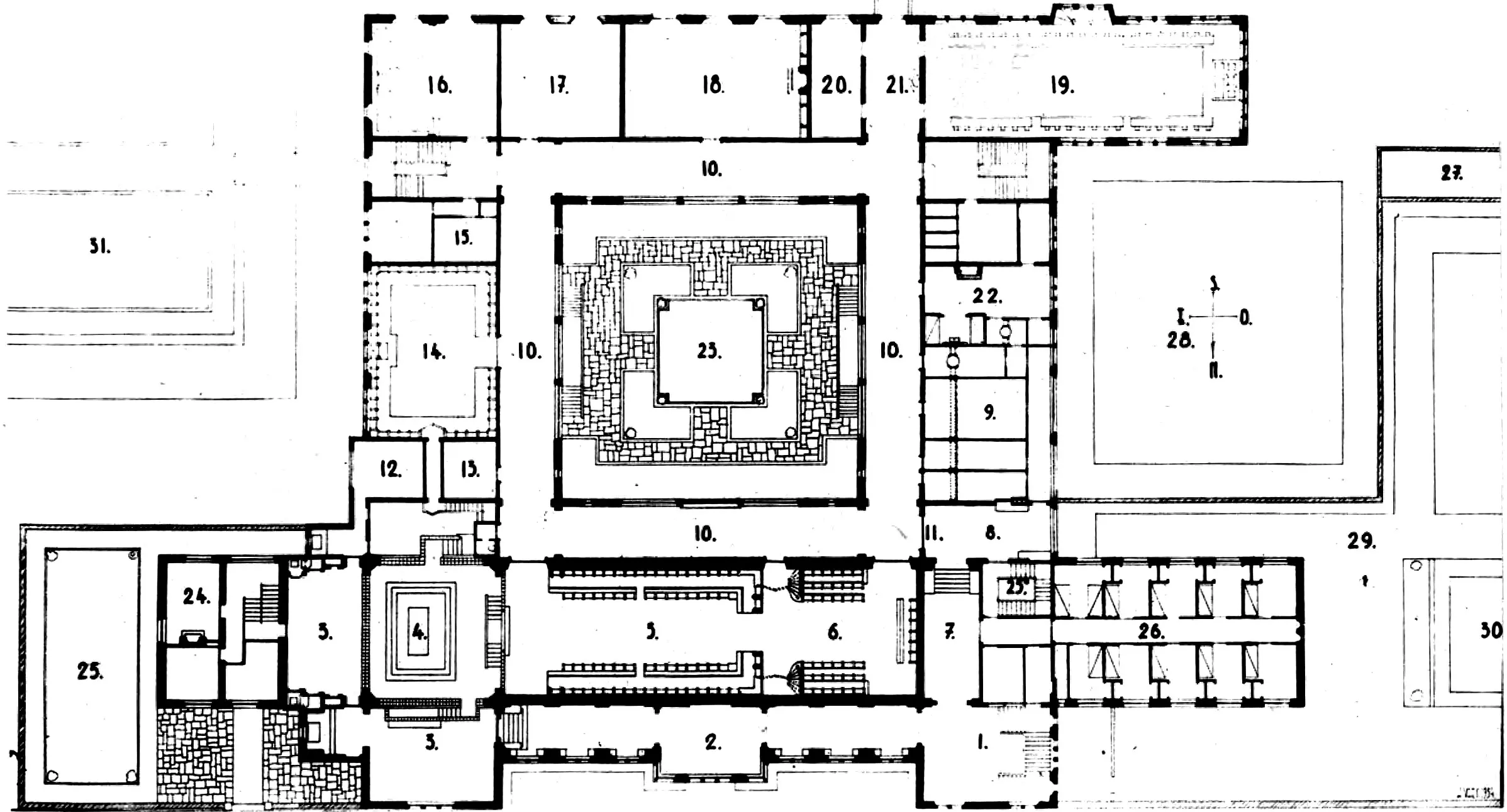 Les intérieurs sont marqués par l'usage de pierres et de céramiques noires pour les angles des murs, les plinthes et les encadrements des baies qui contrastent avec les plafonnages blancs et les menuiseries en wengé. De nombreuses interventions artistiques peuplent les espaces internes.
