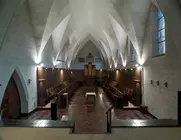 L'église est disposée le long de la façade nord face au paysage. Elle est inscrite dans la longue façade de 80 m rythmée par la présence de pignons qui articulent la composition en correspondance des volumes perpendiculaires du complexe.