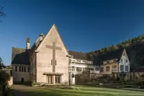 Le réfectoire et les locaux de résidence sont disposés vers le jardin de l'abbaye à l'ouest. L'ensemble est construit en béton avec un parement extérieur enduit sobre et clair.
