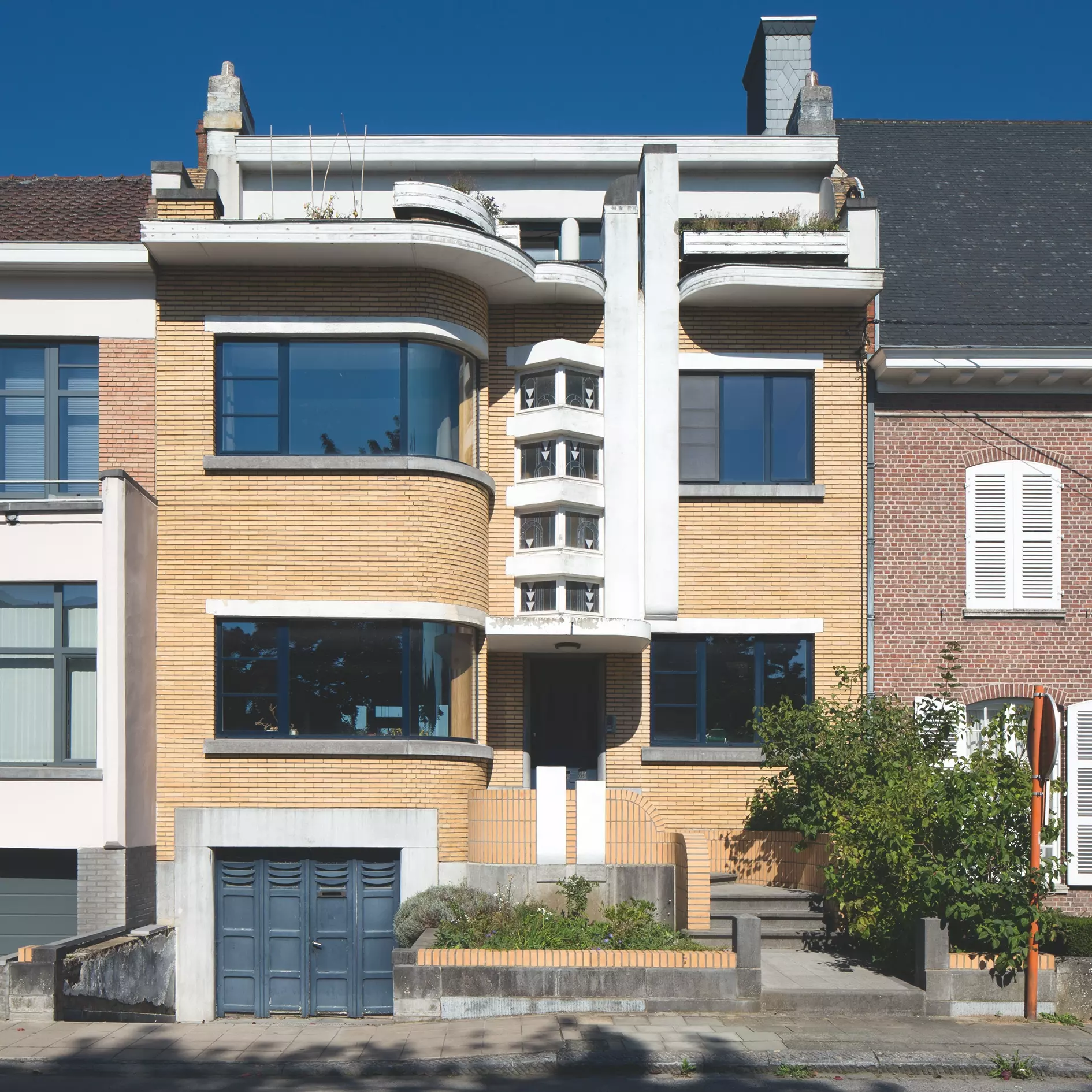 Conçue par un élève de Victor Horta, la maison présente une façade qui fait écho à l'organisation interne de la maison. La travée gauche éclaire, par deux larges baies courbes, les pièces de jour, tandis que la travée de droite abrite le bureau et les pièces de service. Au centre, deux piliers blancs jumelés prolongent en hauteur la porte d'entrée, accolés à quatre baies en biseau intégrant des vitraux de verre martelé.