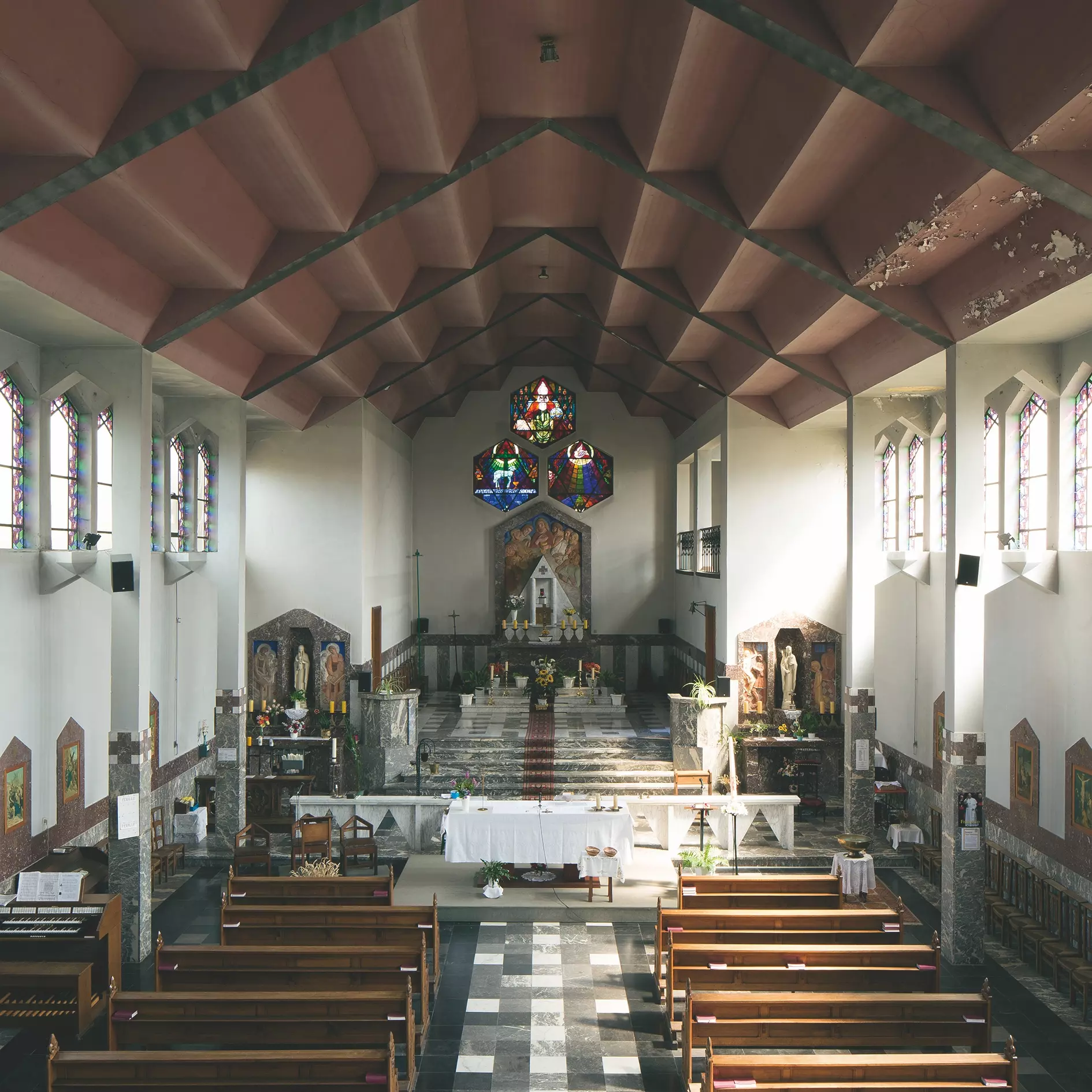 De nombreux éléments décoratifs géométrisés rappellent sa présence, en particulier à travers la rose représentée dans l'architecture, le mobilier, la ferronnerie et les vitraux. De part et d'autre de l'entrée, un mineur et sa famille accueillent le croyant. À l'intérieur, les apôtres du maître autel, dans le chœur, ont des traits burinés, rappelant ceux des mineurs. Les deux autres autels évoquent également le monde du travail, à travers le choix et le traitement des images des saints – dont sainte Barbe, patronne des mineurs – et de Jésus.