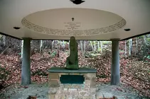 Cette petite chapelle commémorative est érigée à proximité du bunker utilisé par Hitler pendant l'offensive de 1940. Ce lieu est le théâtre des activités d'un célèbre maquis belge, le groupe D du Service Hotton, très actif dans la région dès 1943, et le monument est construit à la mémoire de ses morts. Il s'agit d'une construction qui utilise des éléments très simples articulés par une géométrie forte. Sur une terrasse en moellons en bordure d'une route et au pied d'une colline de sapins (une forêt de bouleaux les a remplacés de nos jours), quatre colonnes toscanes en pierre bleue forment un carré et soutiennent un toit pyramidal couvert d'ardoises. Le volume est évidé dans son milieu par une voûte en coupole. Sur son plafond plâtré en blanc sont inscrits les quarante-quatre noms des maquisards tombés au combat, exécutés ou morts en captivité. Les colonnes sont posées sur un socle en U réalisé avec des pierres locales, seul le côté proche du chemin est laissé au niveau plus bas pour accéder au centre où s'élève un autel en pierre surmonté par une sculpture. L'architecture utilise un dispositif solennel, mais l'approche à la chapelle suit un mouvement en oblique qui désamorce la lourdeur de l'effet axial et permet d'apprécier le volume par rapport à l'environnement naturel. Cette réalisation s'inspire de la « Chapelle dans les bois » (Woodland Chapel) que l'architecte suédois Erik Gunnar Asplund réalise en 1920 dans le cimetière ouest de Stockholm. Bastin et Dupuis le visitent en 1947. Ils empruntent plusieurs éléments, mais ils réalisent une remarquable synthèse, émouvante et sereine.