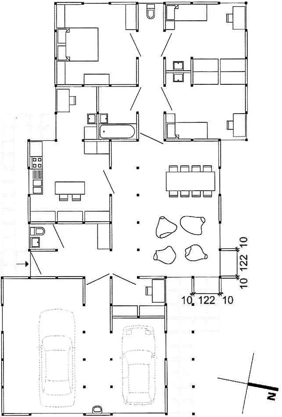 Avec quelques itérations entre concepteur et habitants, le plan trouve une réponse synthétique. De plain-pied et connecté au jardin, le volume est rythmé par quinze travées, et l'axe d'appui central de la maison détermine l'espace de circulation.