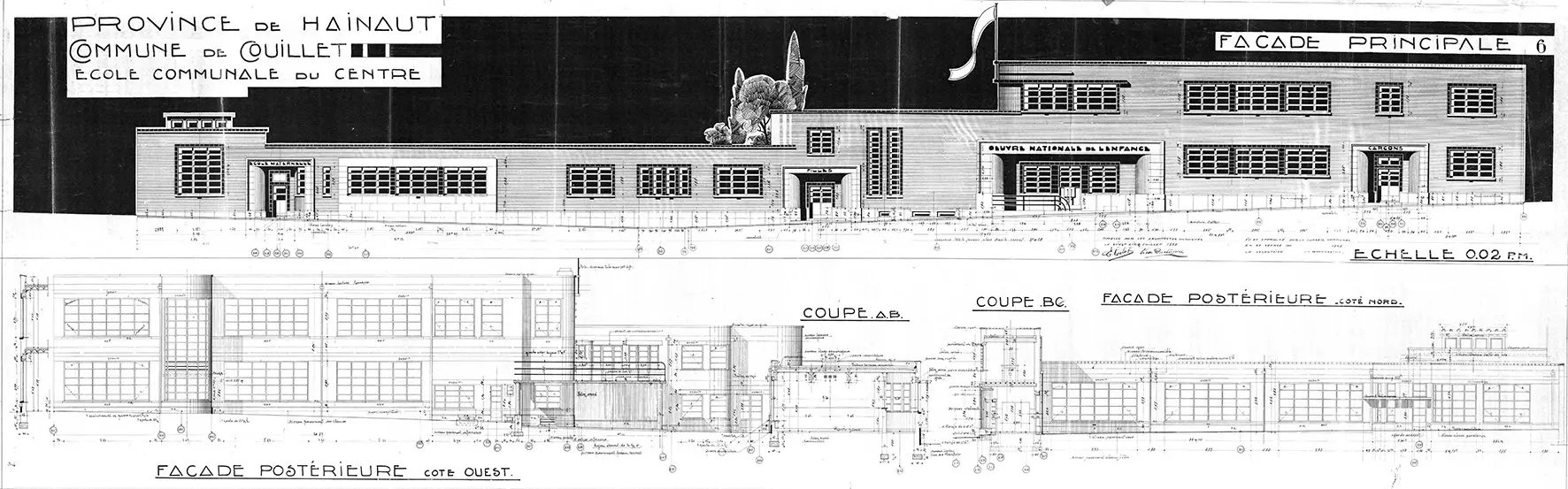 Située près de la gare de Couillet, l'école du Centre regroupe plusieurs bâtiments : un espace pour les gardiennes comprenant une aire de jeux intérieure et une classe ; deux écoles, une pour filles et l'autre pour garçons, composées chacune de trois classes. Entre ces deux établissements, un poste de l'uvre nationale de l'enfance (ONE) sert de cabinet médical, d'infirmerie et de dépôt de lait.
