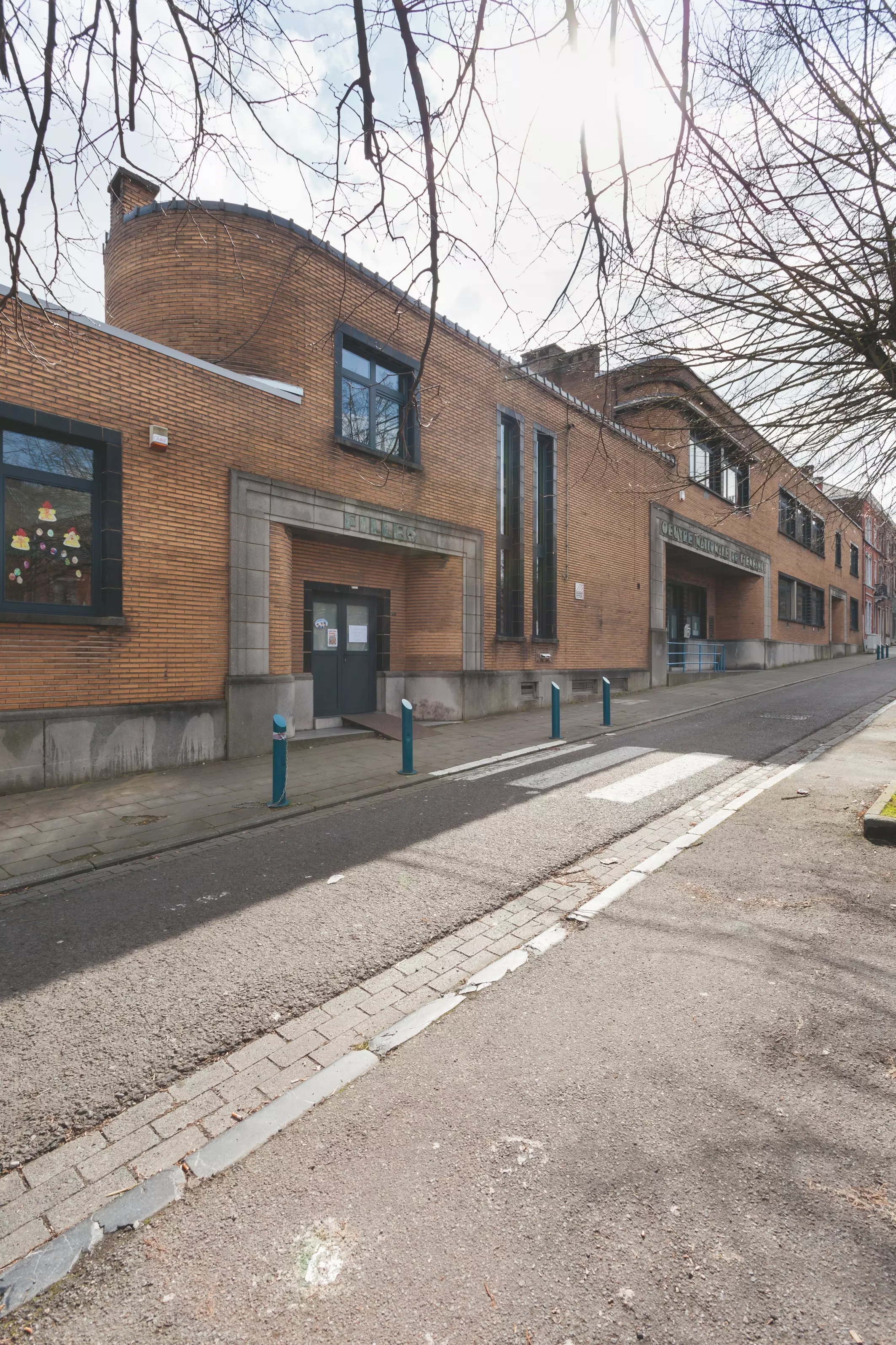Les classes, bureaux et locaux techniques propres à chaque entité sont séparés de la rue par un long corridor intérieur situé derrière la façade, limitant ainsi les bruits extérieurs. Invisible de la rue, la salle de gymnastique borde la large cour intérieure dans un second bâtiment.