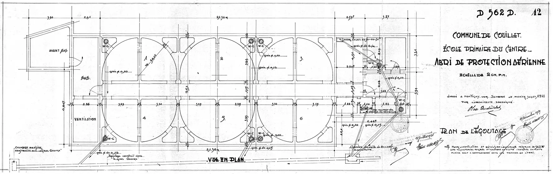 Un abri anti-aérien est construit en sous-sol. L'écriture des deux architectes est particulièrement soignée. Les soubassements en pierre reconstituée et ciselée et les briques de parement de tonalité cuir donnent une fluidité toute moderniste à ces quatre entités différentes et autonomes (chacune ayant son entrée particulière), construites en gradin, et ce, afin de se conformer au dénivelé du terrain.