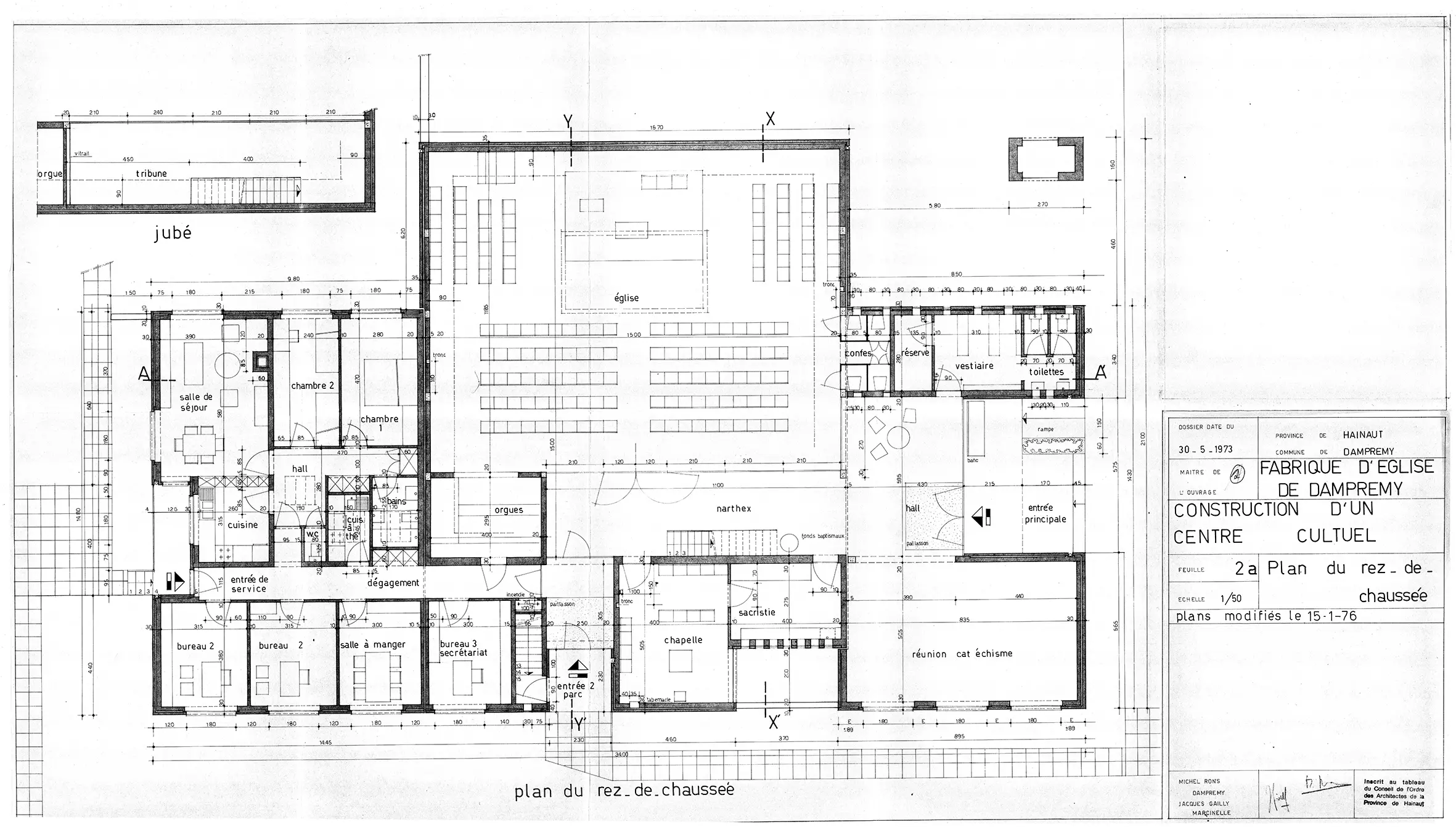 À la suite de la démolition de l'ancienne église paroissiale datant du XIXe siècle pour cause d'instabilité des sols, le Conseil de la fabrique d'église propose à l'architecte de collaborer sur ce projet de reconstruction. S'insérant dans le renouveau de la liturgie et des espaces de congrégation souhaités par le concile de Vatican II, le projet consiste en l'aménagement d'une salle de cérémonie, pouvant également servir de salle de conférences et de concert.