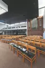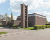Le campanile signale la fonction religieuse du bâtiment en une composition minimaliste servant de cadre aux cloches récupérées du précédent clocher. L'architecture orthogonale confère à cette construction un équilibre issu d'une conjonction de volumes en briques et de fins bandeaux de fenêtres couronnant l'édifice.