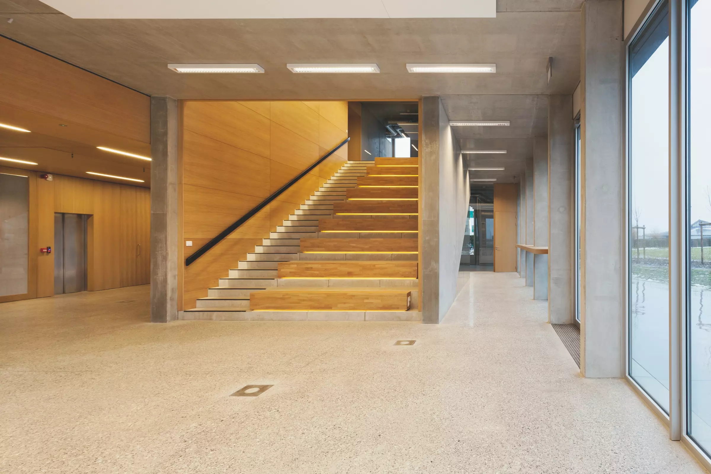 La simplicité du parti architectural est à l'image de la sobriété des finitions, jouant sur le clair-obscur entre intérieur (sol en granito, structure en béton apparent et revêtement en chêne clair) et extérieur (bardage extérieur en Eternit gris foncé comme les châssis en aluminium).