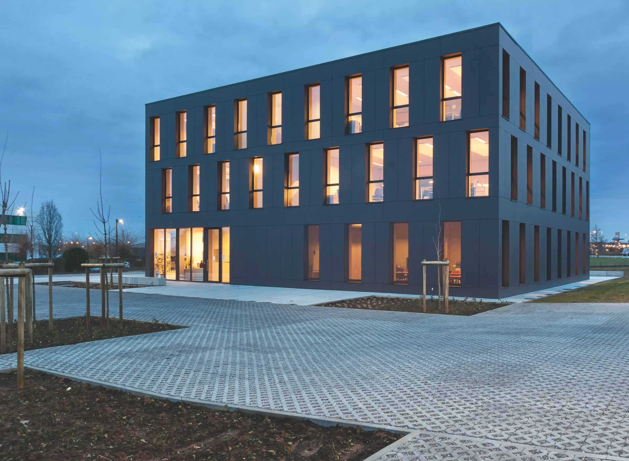 Proposant une surface utile de 1 500 m² de bureaux sur trois niveaux, la nouvelle construction adopte une forme cubique compacte, avec ses quatre façades orientées vers les points cardinaux – l'angle au nord accueillant l'entrée, face au parking paysagé.