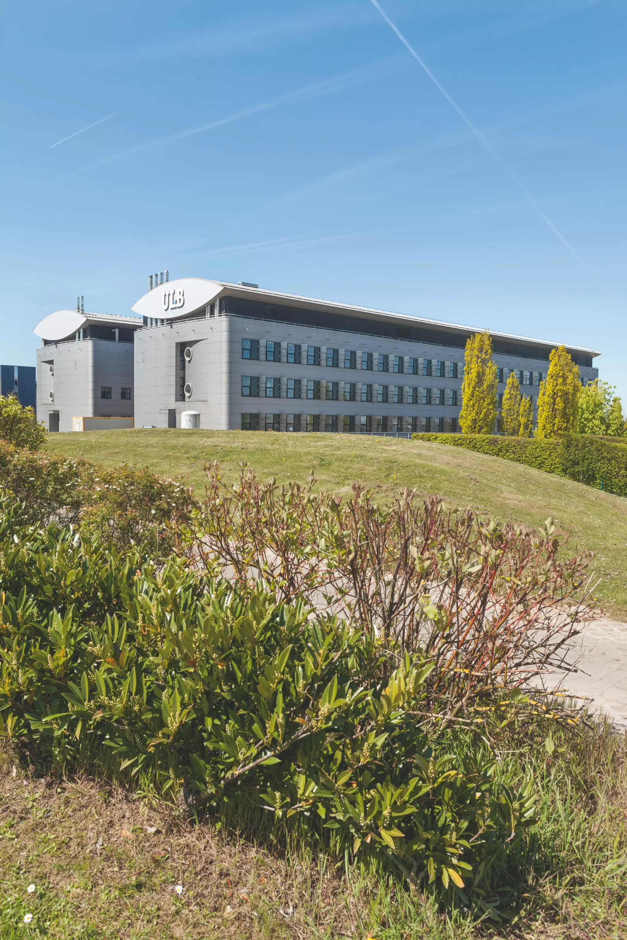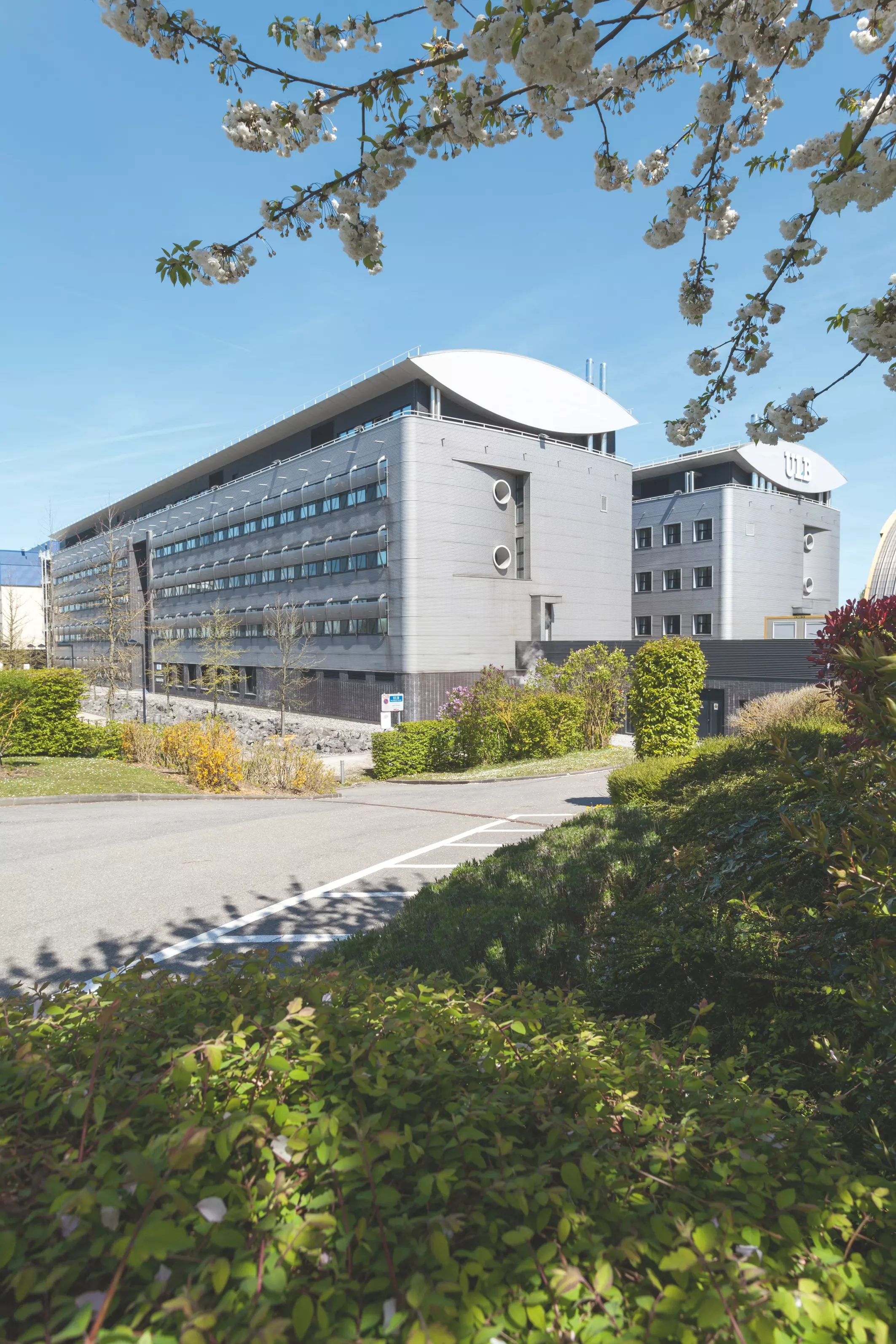 Son plan en amande rencontre ses voisins par deux sas vitrés sur l'ensemble de la hauteur du bâtiment, marquant ainsi la position des circulations verticales et des entrées latérales. Ce même élément de composition ovoïde se retrouve par deux fois couché, coiffant chacun des bâtiments jumeaux, et dont le débord abrite une coursive, et dont le dessin évoque une paire d'yeux plissés, où l'on peut lire, en lettres capitales, « ULB ».