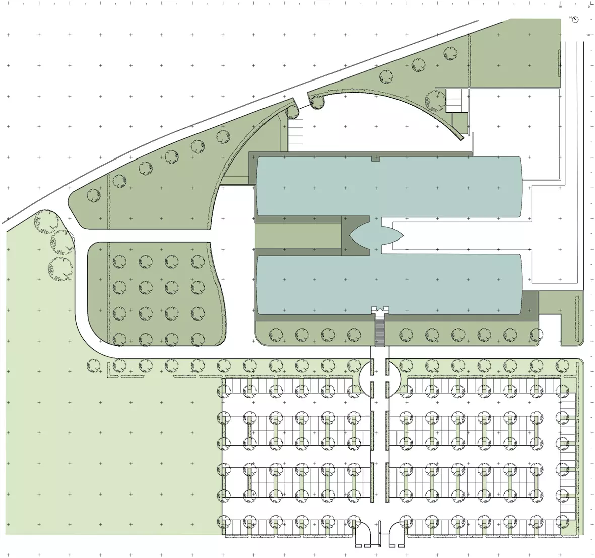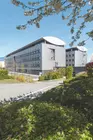 Sa silhouette évoque celle de son possible référent, l'usine Vitra, conçue dans les années 1980 par l'architecte britannique Nicolas Grimshaw. Le volume emballé de tôles se trouve ici percé sur sa longueur par des baies greffées de délicates arêtes d'acier servant de support aux pare-soleil. Les volumes symétriques dégagent ainsi un vide central asphalté, où le rythme irrégulier des fenestrations rappelle le rythme lent du soleil. Au centre de cette faille surgit une tour panoptique de béton partiellement aveugle.