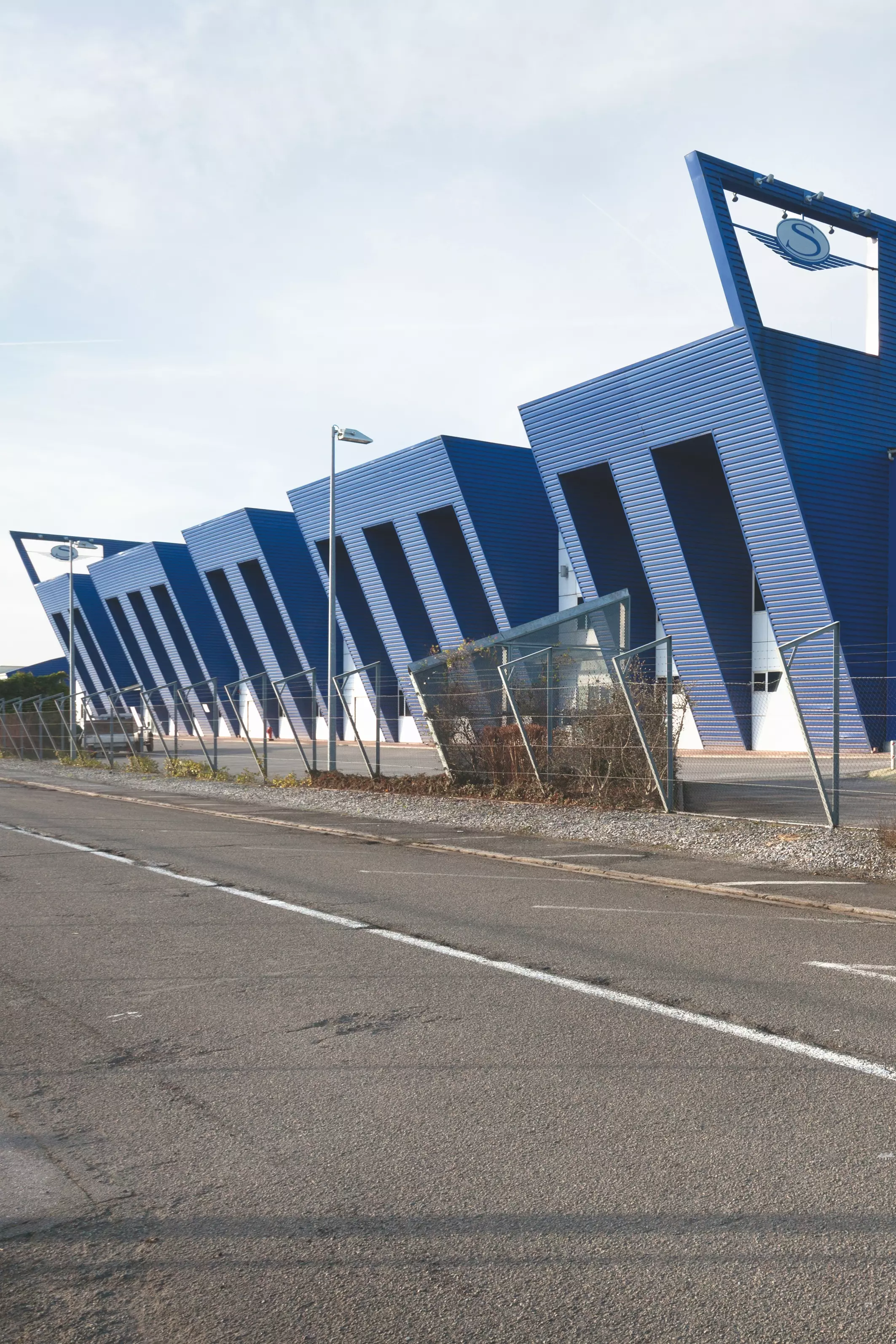 L'habillage des façades des halls des ateliers procède d'un véritable carénage et renvoie tant aux bords d'attaque aérodynamiques, spécialité de l'entreprise, qu'au monde céleste en général. Il permet aussi aux différents bâtiments industriels d'entretenir un rapport étroit avec leur contexte. Cette relation se lit avec évidence dans son rapport à la rue des Fusillés dans la manière dont les saillies métalliques rythment la chaussée. Plus subtilement, cette relation se traduit également dans l'intégration des piliers de la clôture, éléments souvent délaissés, le long de la chaussée, aux formes dynamiques en acier aux couleurs de l'entreprise.
