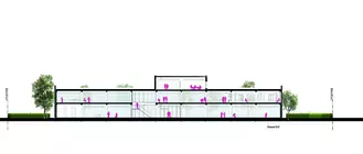Seuls deux patios latéraux, échancrures dans les façades à l'est et au sud, découpent le profil compact. Un volume en métal et verre surplombe l'ensemble et le traverse en définissant l'axe d'accès et de circulation, mais aussi les espaces collectifs du bâtiment.
