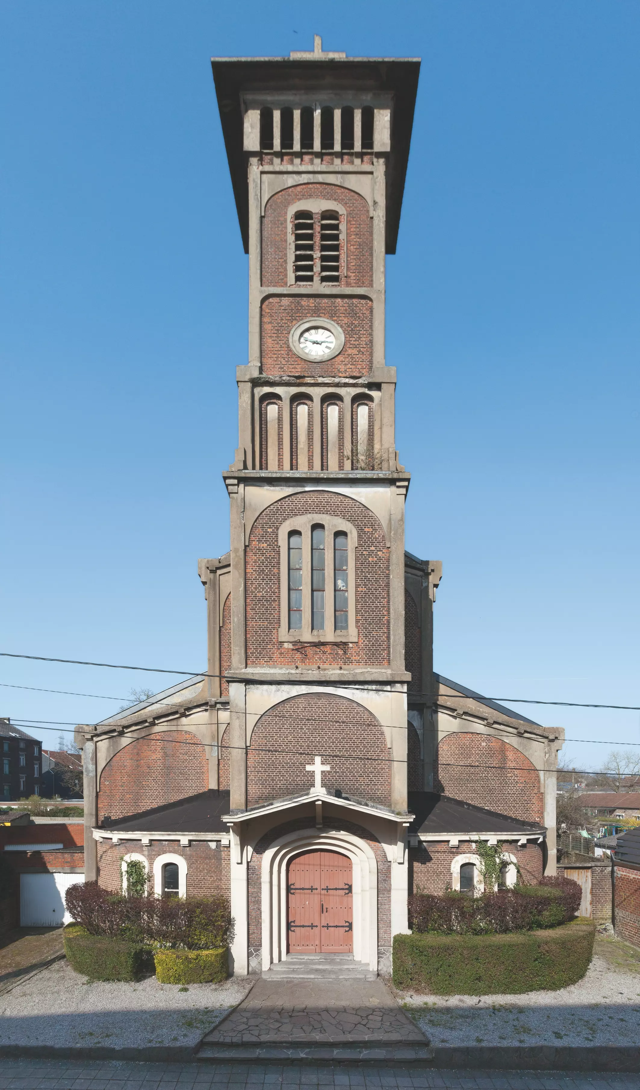 Véritable signal dans le quartier, l'édifice se distingue par l'élancement de la tour campanile de plan quadrangulaire située en avant-corps, formée de niveaux de largeur décroissante et coiffée d'une toiture à pans débordants surmontée d'une haute croix en béton. Les volumes sont ouverts tantôt d'une baie double ou triple, tantôt d'une ceinture d'arcatures étroites, tantôt encore d'un œil-de-bœuf occupé par une horloge. Cette tour-clocher allie l'esthétique industrielle à une transposition moderne des campaniles romans ou de la Renaissance italienne, florentine notamment. Au pied de la tour, le porche à triple voussure est protégé d'un auvent et flanqué d'absides.
