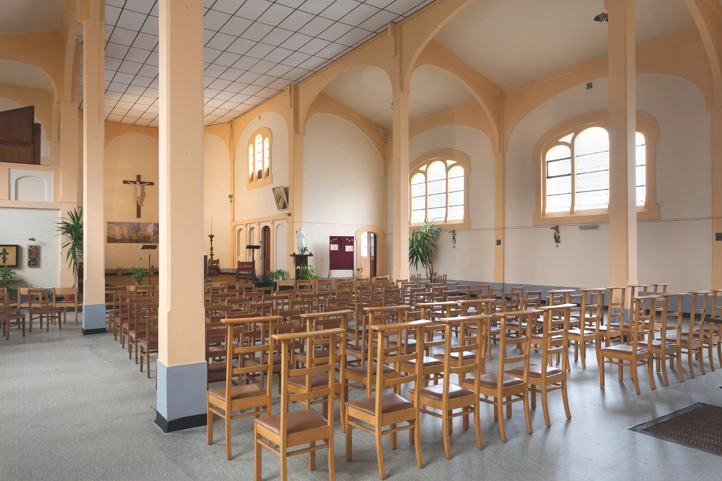 Dans le quartier du théâtre Varia, cet édifice religieux doit sa forme particulière à sa structure en béton apparente charpentant la construction et créant un dialogue chromatique avec les parois en briques rouges.