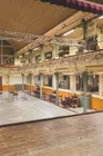 Le bâtiment en front de rue est occupé par une brasserie qui s'ouvre sur une large cage d'escalier illuminée par une grande verrière colorée et sur un long couloir lumineux menant à la salle des fêtes.