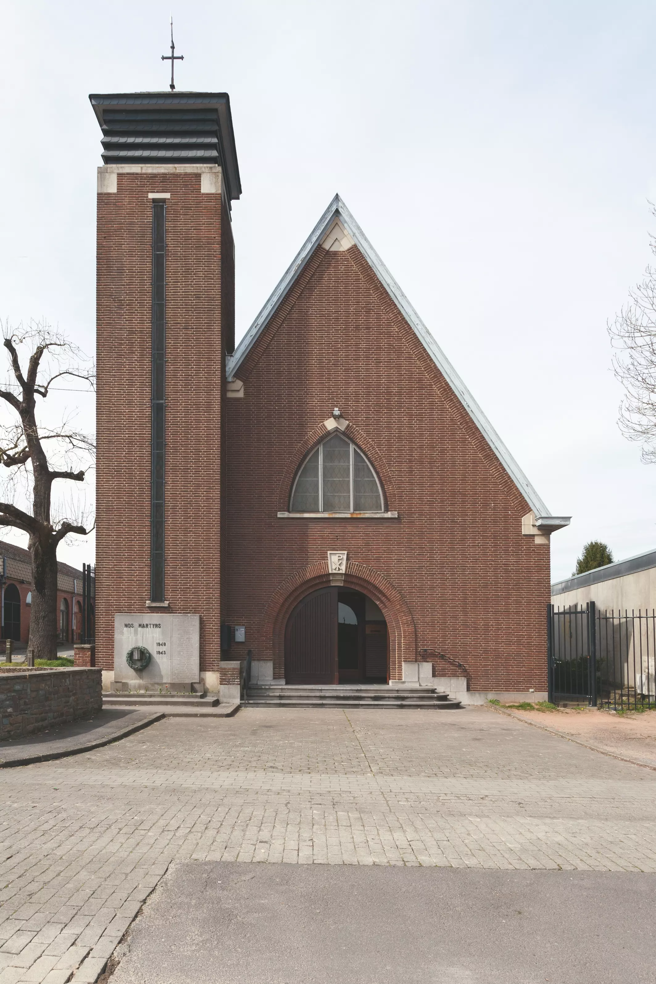 La particularité de ce bâtiment en briques rouges est la présence d'une tour-clocher en léger décrochage de la façade principale, tel un clin d'œil aux campaniles italiens. Un monument commémoratif de la deuxième Guerre mondiale lui est accolé. L'édifice – une mononef à trois travées – se base sur un plan en croix latine et se termine par une voûte en berceau brisé. Cet arc brisé, en tiers-point, se décline dans les différentes baies et ponctue, comme élément décoratif récurrent, l'entièreté du bâtiment.