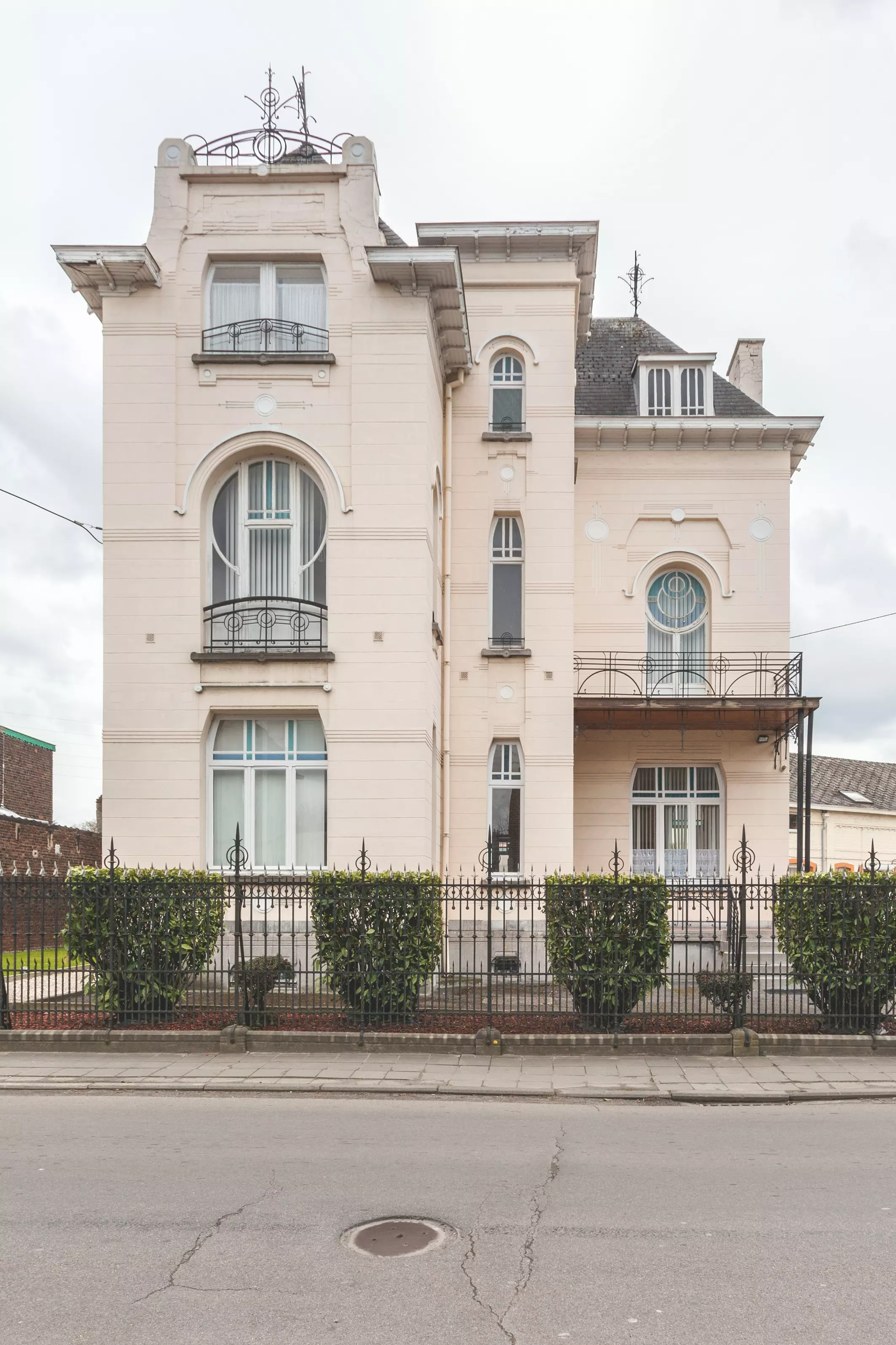 Bâtie en retrait de la voirie, cette imposante demeure composée de volumes de différentes hauteurs et largeurs est conçue dans un Art nouveau géométrique inspiré de la Sécession viennoise.
