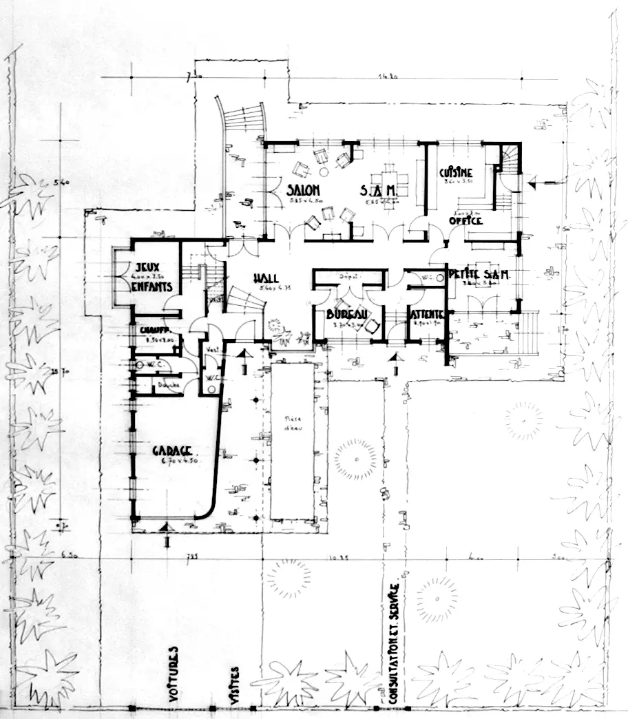 Les deux entités principales s'ancrent de part et d'autre du hall. Du côté droit, un volume bas, orienté vers le jardin, accueille le séjour, la salle à manger, la cuisine et un cabinet de consultation, ce dernier disposant d'une entrée professionnelle à rue séparée.