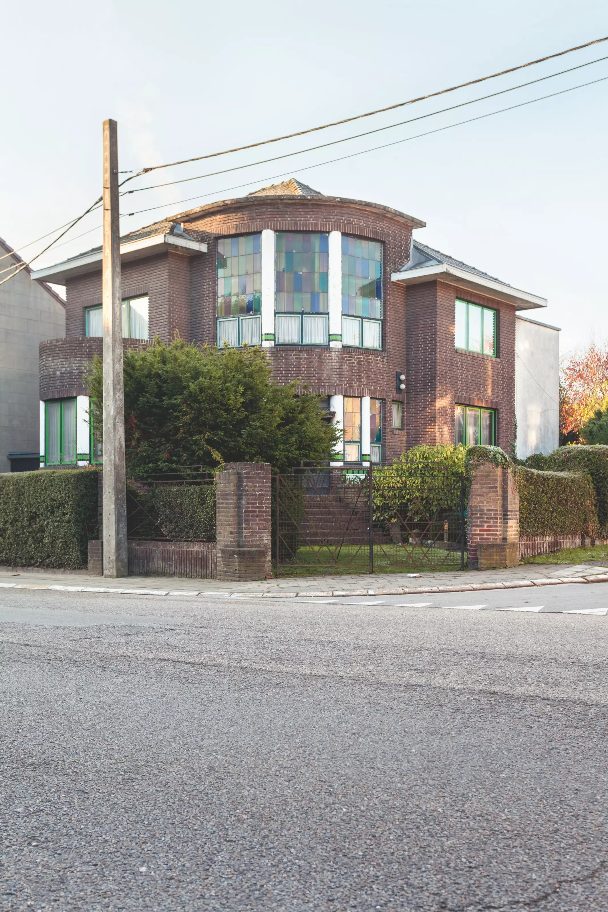 Deux loggias semi-circulaires complètent le dispositif spatial, l'une à l'avant et l'autre à l'arrière. La palette des matériaux use du vocabulaire moderniste, mariant parements horizontaux en briques, montants verticaux en béton peint, fines menuiseries métalliques, ornées, pour certaines, de vitraux colorés au dessin géométrique.