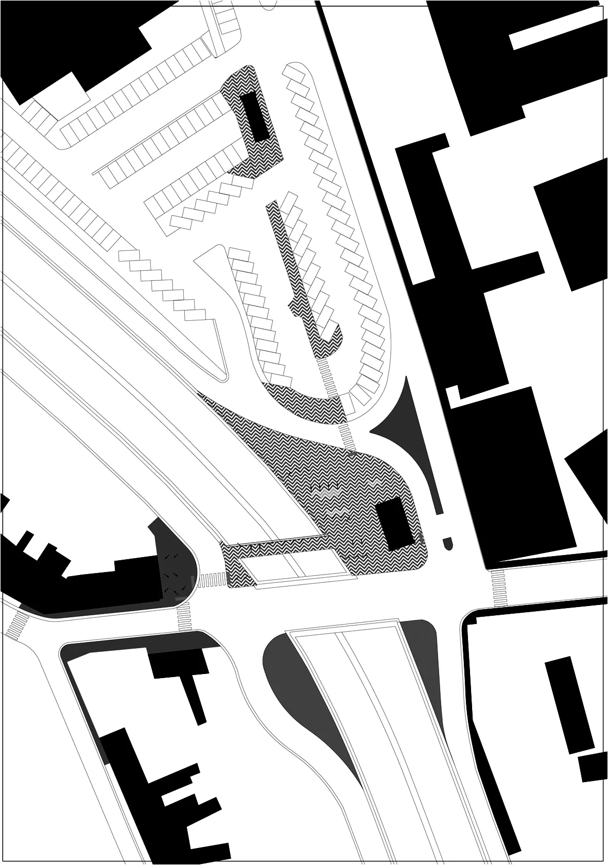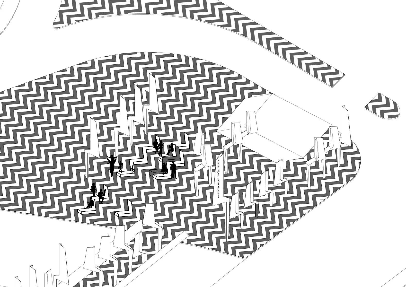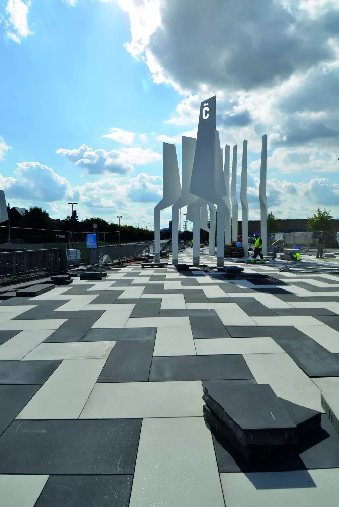 La liaison entre la commune de Montignies et le centre commercial Charleroi Ville 2 s'est ainsi vue renforcée par un travail sur les sols, marqué par un jeu minéral de chevrons gris anthracite et gris clair.