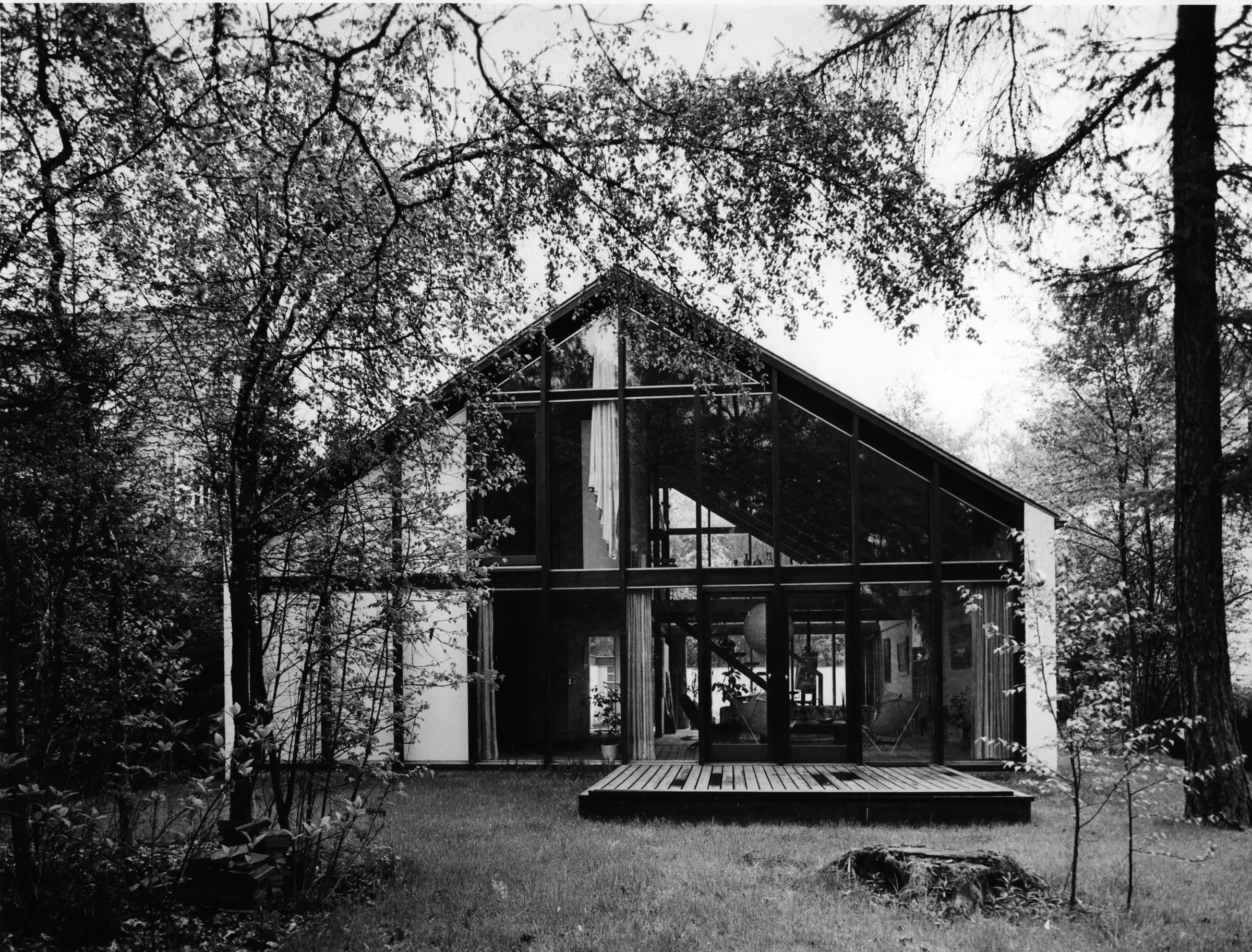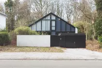 Un enclos d'accueil, en continuité avec l'espace de vie, et un garage, à droite, la précèdent. Le premier – comme le cheminement – évoque un jardin japonais ; le second dissimule son entrée dans le parement de bois foncé. Ainsi protégé du regard, le pignon, presque entièrement vitré, est animé par le quadrillage des châssis au module régulier (cf. résidence des Bruyères). Grâce au traitement similaire du pignon arrière, la lumière traverse maison et atelier, d'est en ouest.