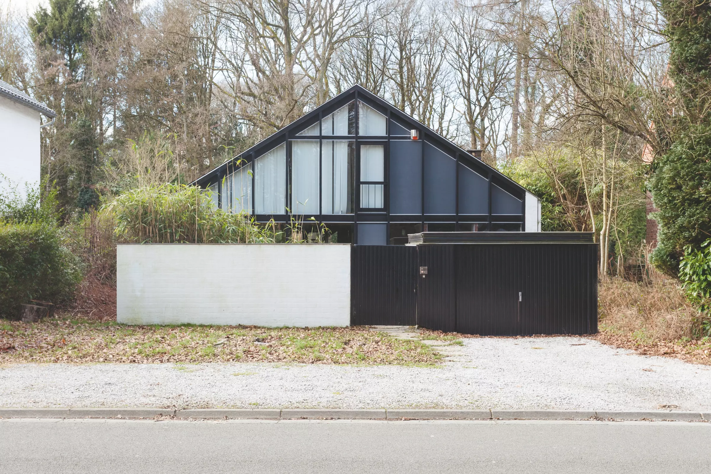 L'artiste fait bâtir cette maison en briques blanches, à l'extérieur comme à l'intérieur, dans un quartier arboré. Le terrain étroit suscite une implantation perpendiculaire à la rue, sous une bâtière symétrique en ardoises.